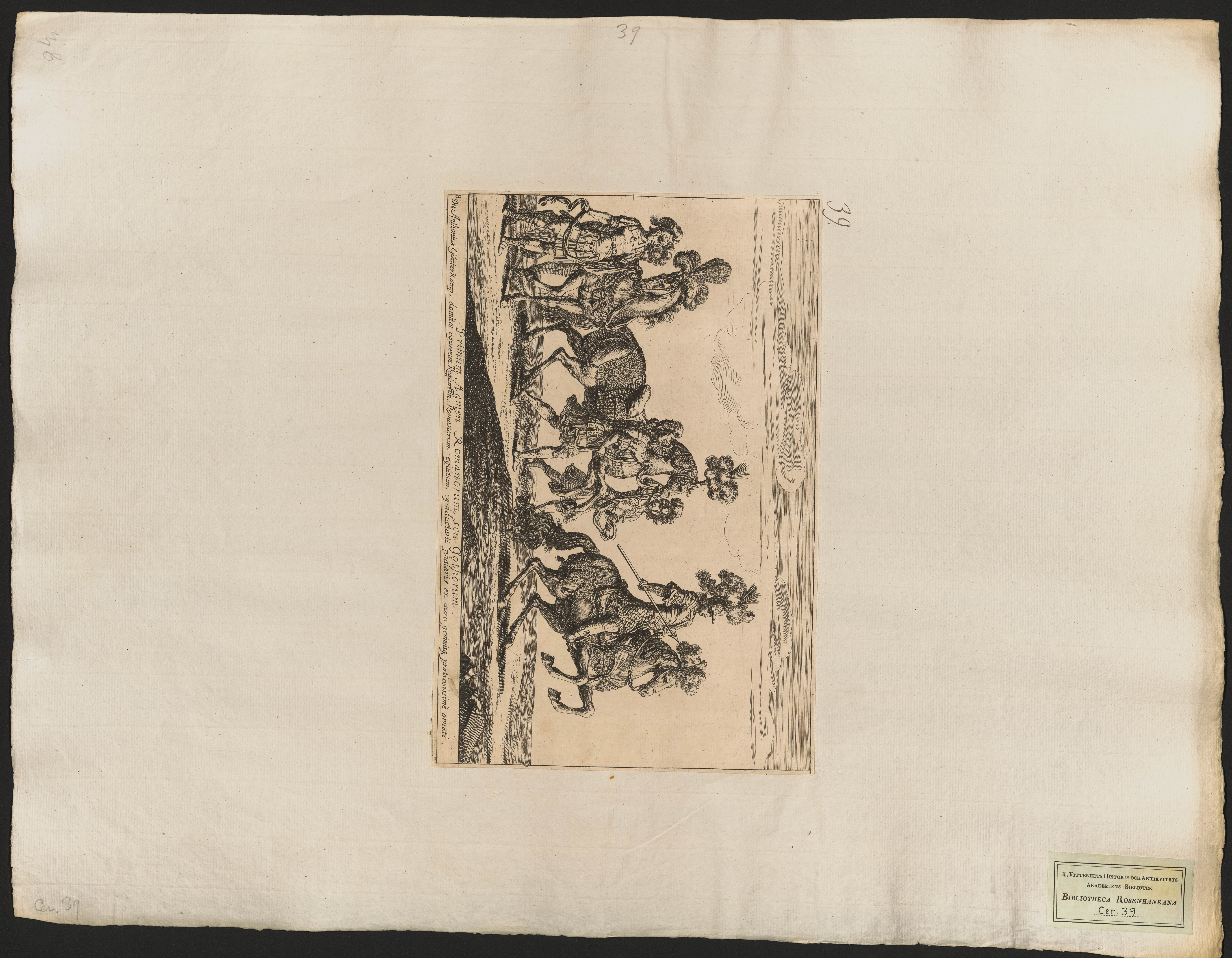 Första skaran: romarna, eller göterna. Herr Anton Günter Campsen, beridare av kungens hästar. Det romerska kavalleriets handhästar mycket rikt ornerade med utrustningar av guld och ädla stenar