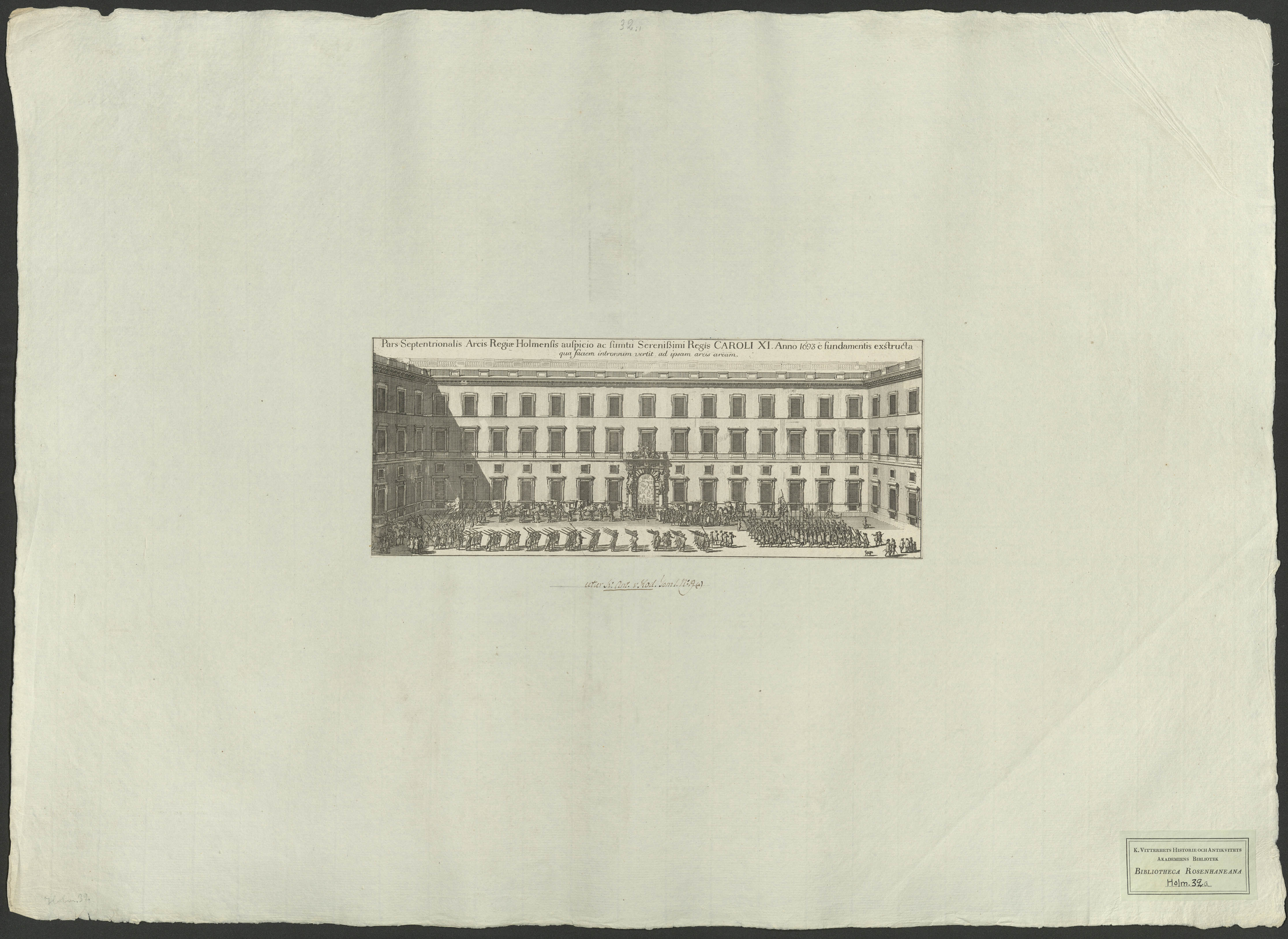 Stockholms slotts norra länga som på den högmäktige konung Karl XI:s tillskyndan och bekostnad uppbyggdes från grunden år 1693, interiör av borggården.