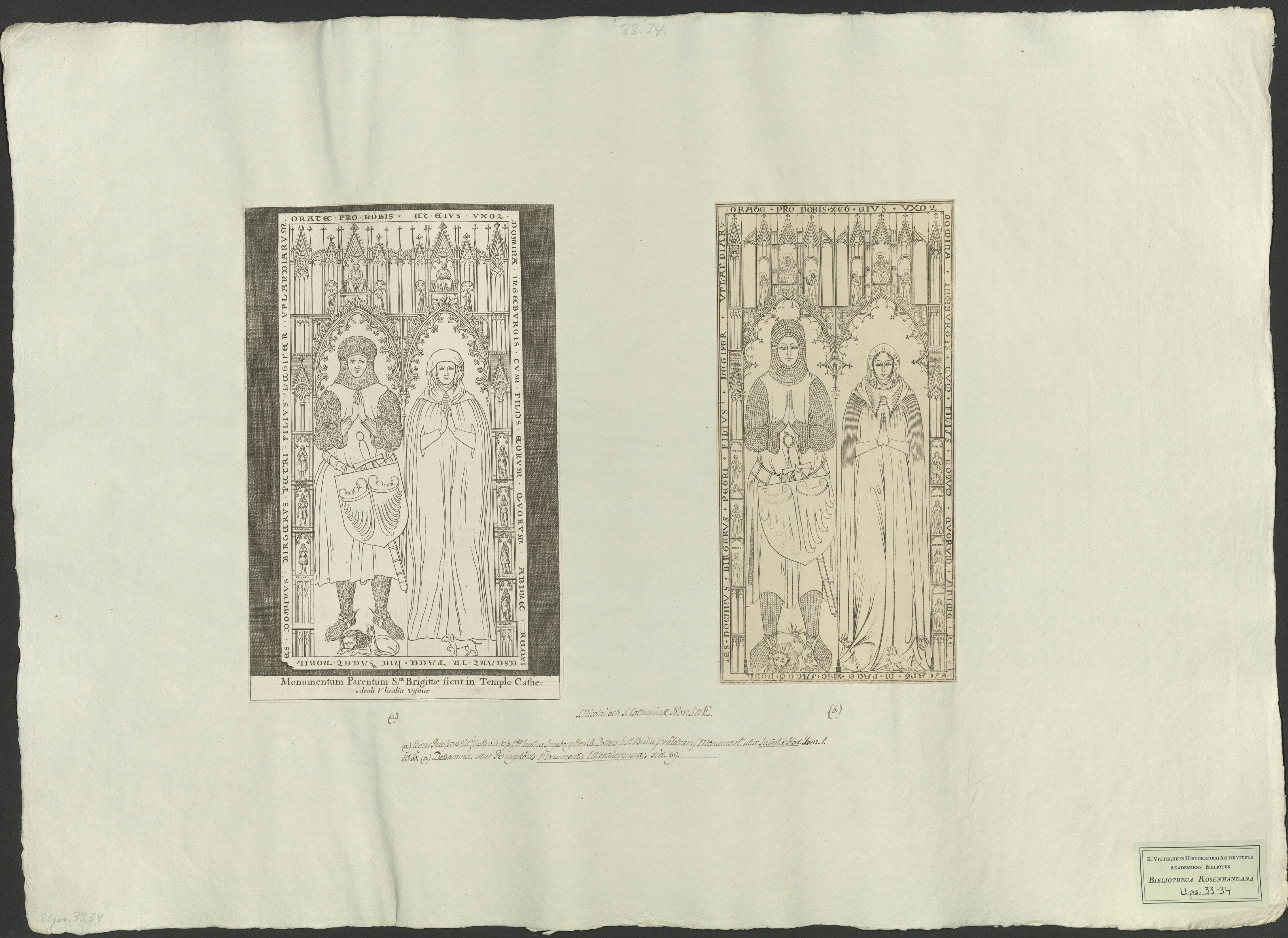 Beskrivning: 1 grafiskt bl. : 1 tryckt ark : Påskrift (gäller planschens båda bilder): "S. Nicolai och S. Catharinae kor. Litt. E. (a) Birger Pedersons till Finsta och dess 2dra hustrus Ingeborg Benktsdotters /: St Britas föräldrar :/ monument utur Sv. Ant. & Hod. Tom. I. No 60. (b). Detsamma utur Peringskiölds Monumenta Ullerakerensia sid 89."