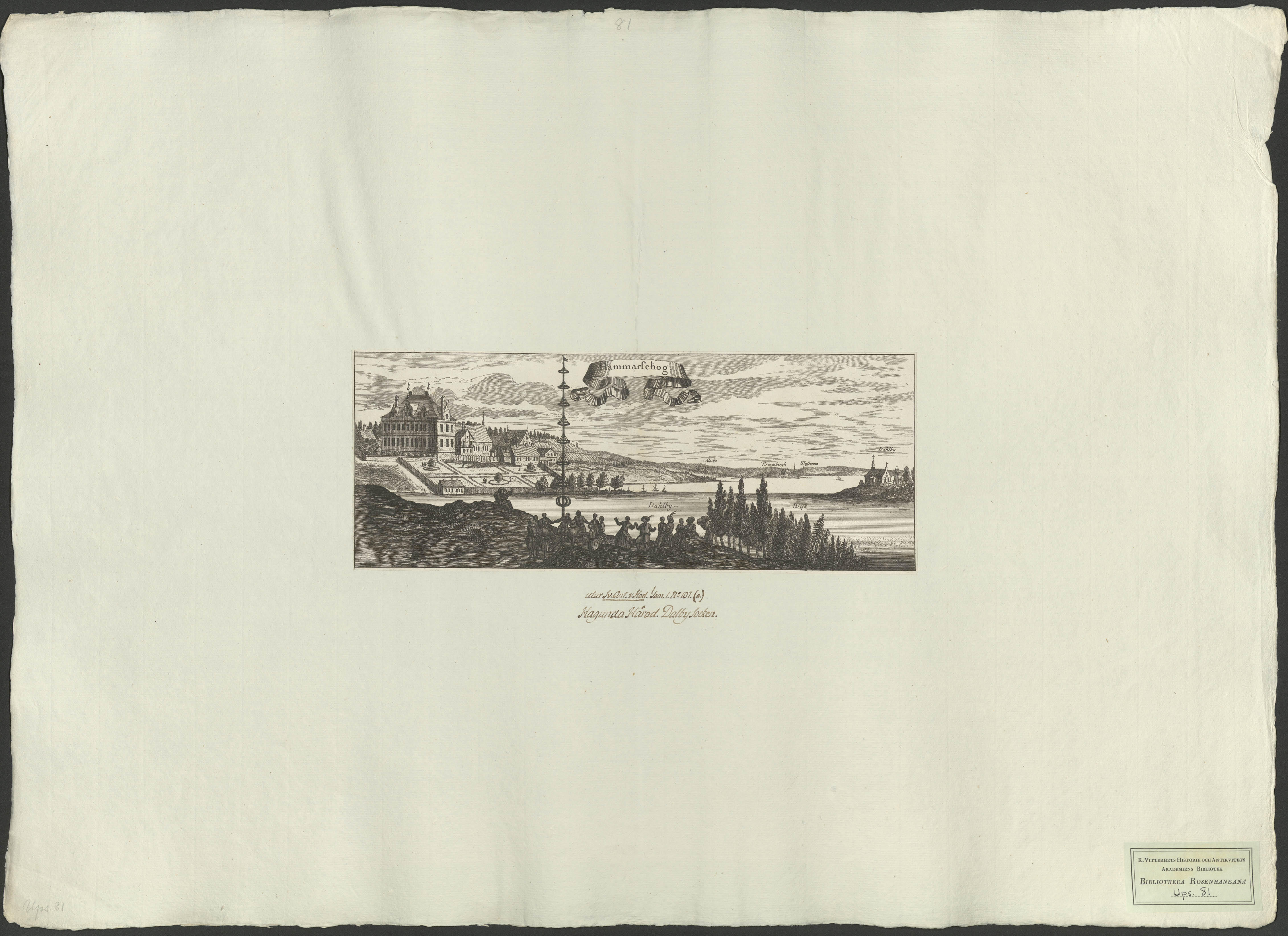 Beskrivning: 1 tryckt ark : [Jean Le Pautre]. Påskrift: "utur Sv. Ant. & Hod. Tom. I. No 107(a). Hagunda härad. Dalby socken."