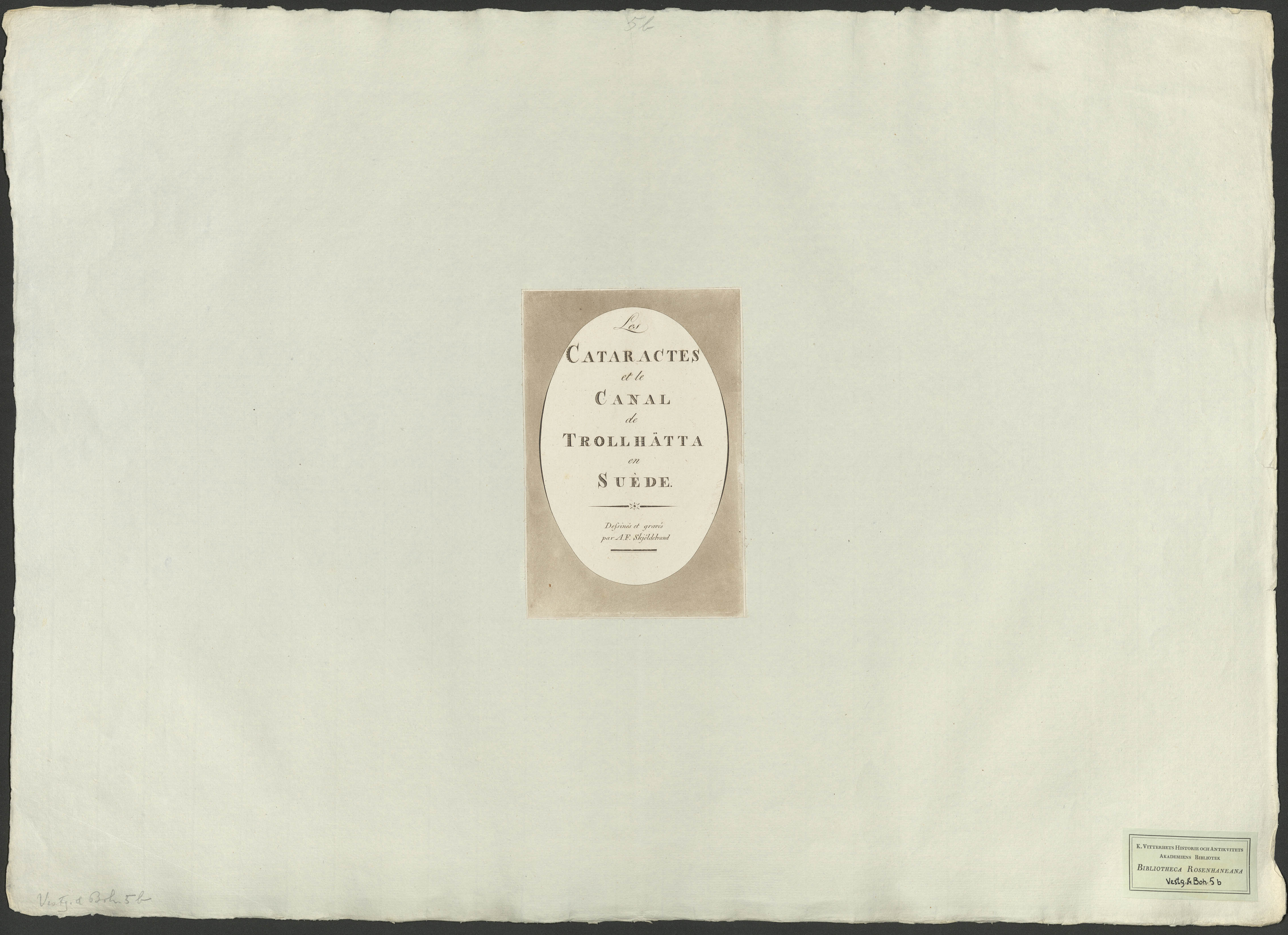 Beskrivning: 1 grafiskt bl. : Titelsida: Description des cataractes et du canal de Trollhätta en Suède; avec un précis historique, par A.F. Skjöldebrand. À Stockholm, imprimée chez Charles Delén, 1804