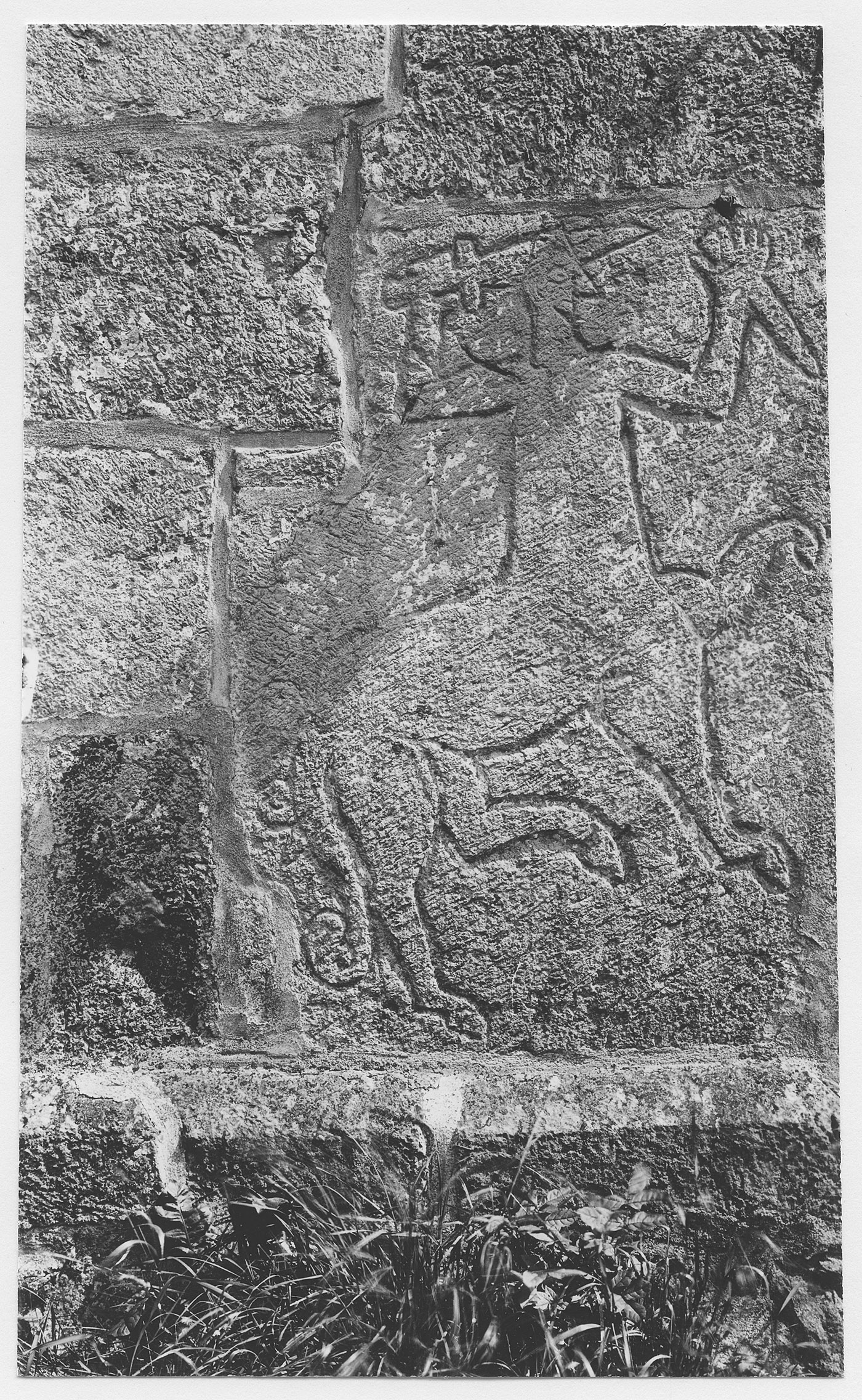 Beskrivning: Bildsten med skulptur i plattrelief inmurad i kyrkans äldre del.