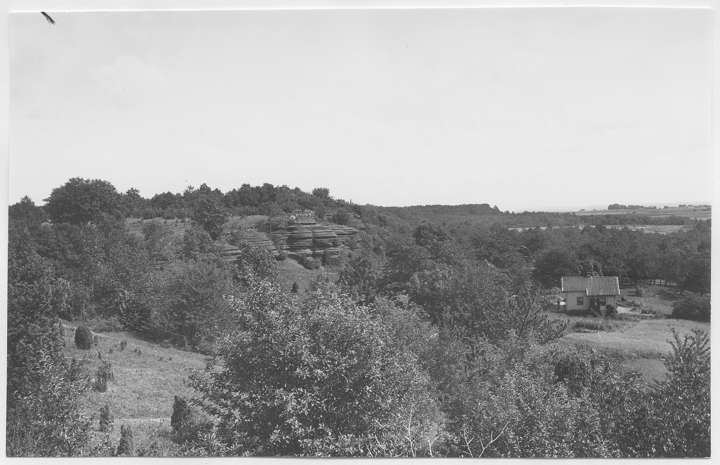 Beskrivning: Martorps klev. Kalkstensterrassen avslutas i Ö och S av lodräta stup med utsprång och stundom fristående pelare.