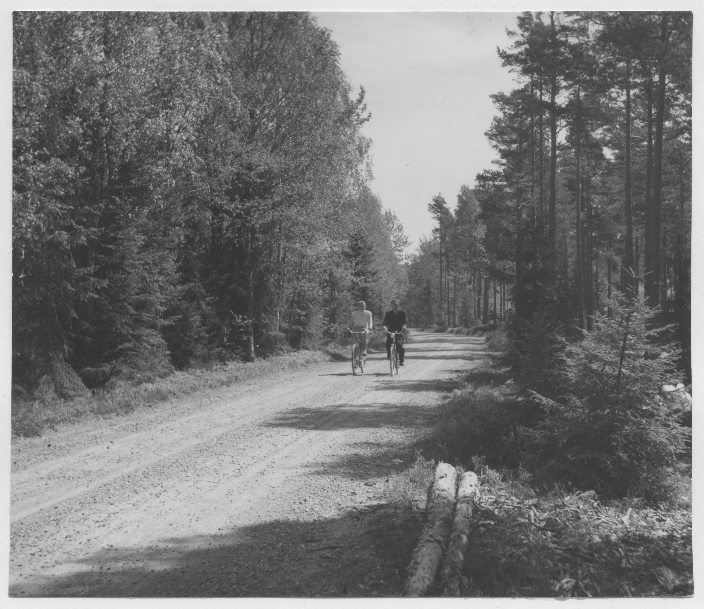 Beskrivning: Landsvägen V om Jakobsbyn. T.v. Björk och asp, t.h. Tall.