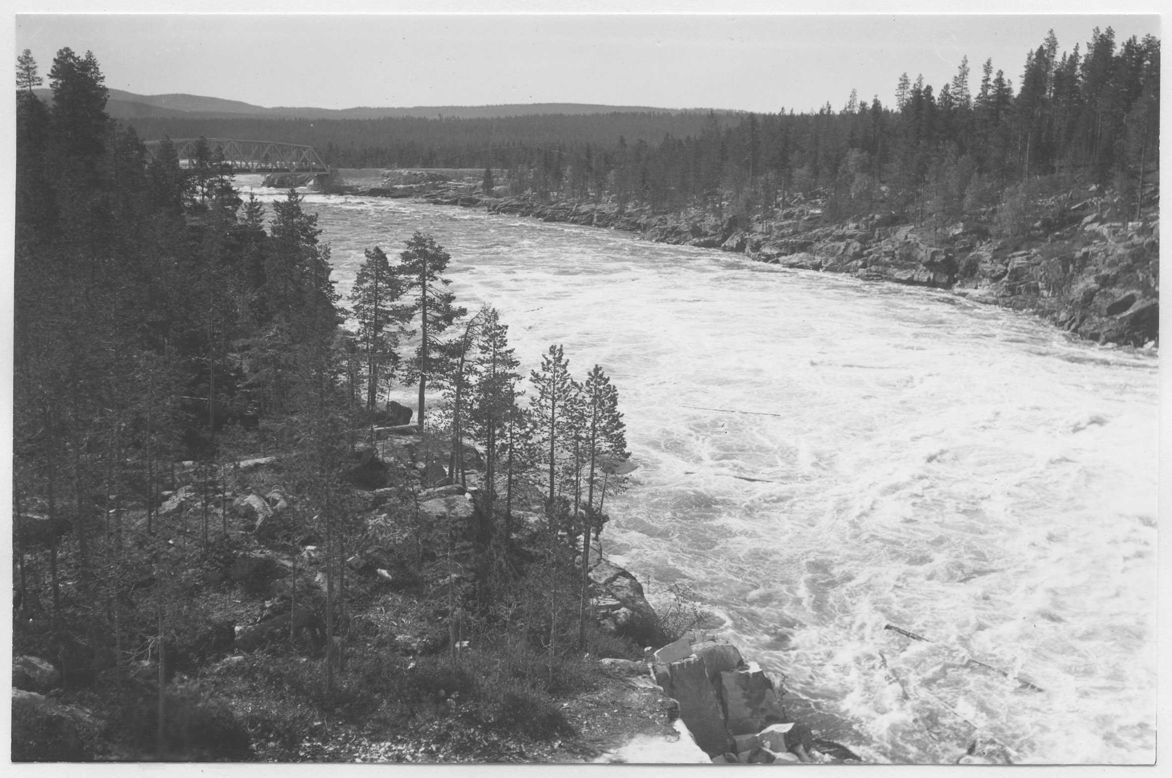 Beskrivning: Akkatsfallen i Lilla Luleälv. I bakgrunden järnvägsbron