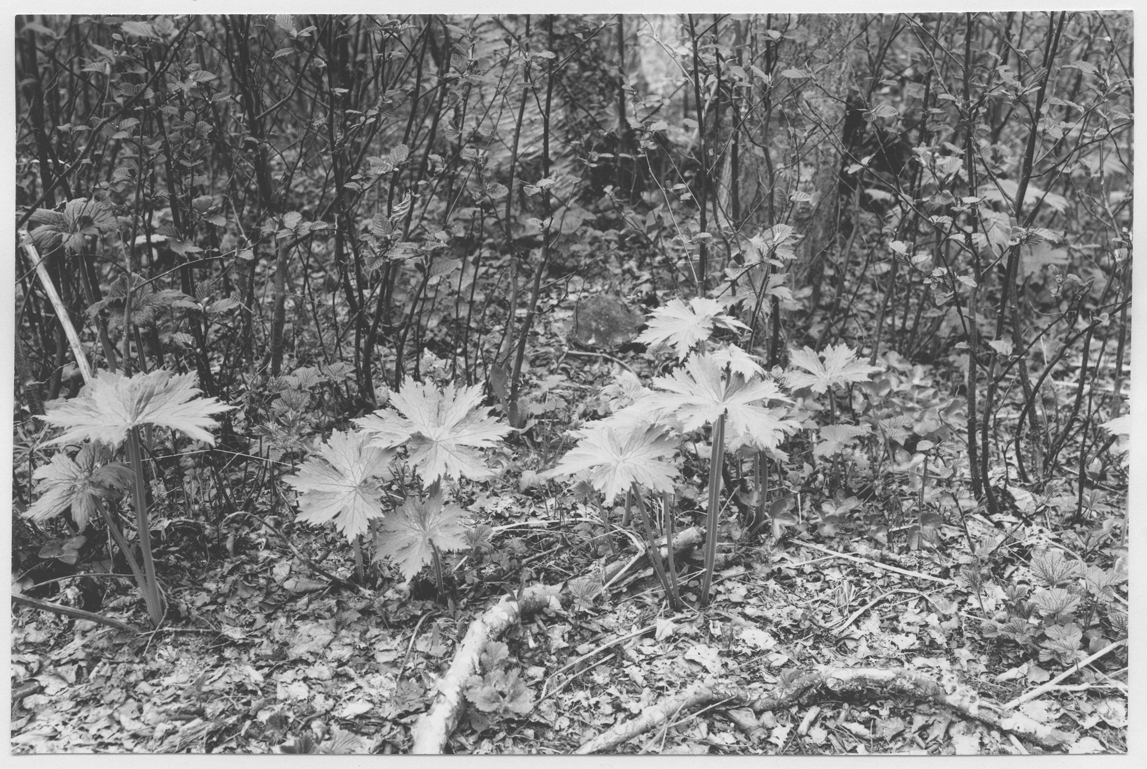 Beskrivning: Den jämtländska odlingens utgångspunkt. Björklöväng nära Frösö kyrka i lövsprickning. Skott av Aconitum septentrionale + Anemone hep. I snår av Alnus incana.