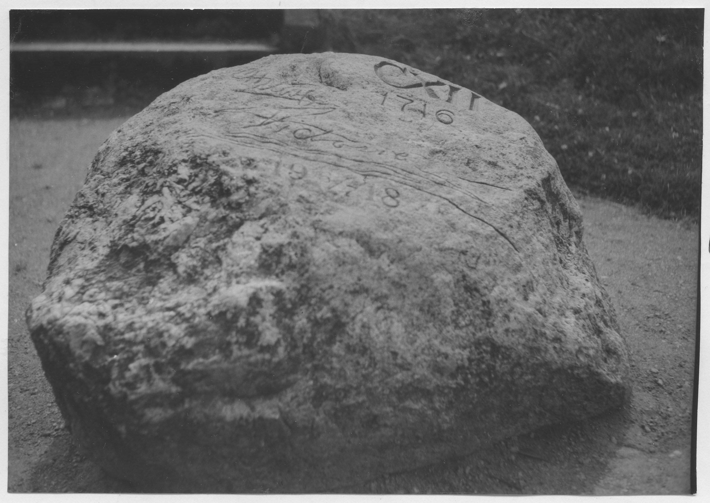 Beskrivning: Minnessten i järnvägsparken. C XII 1716, Gustaf, Victoria 6/7 1918. Gustaf adolf, Louise 16/7 1931.