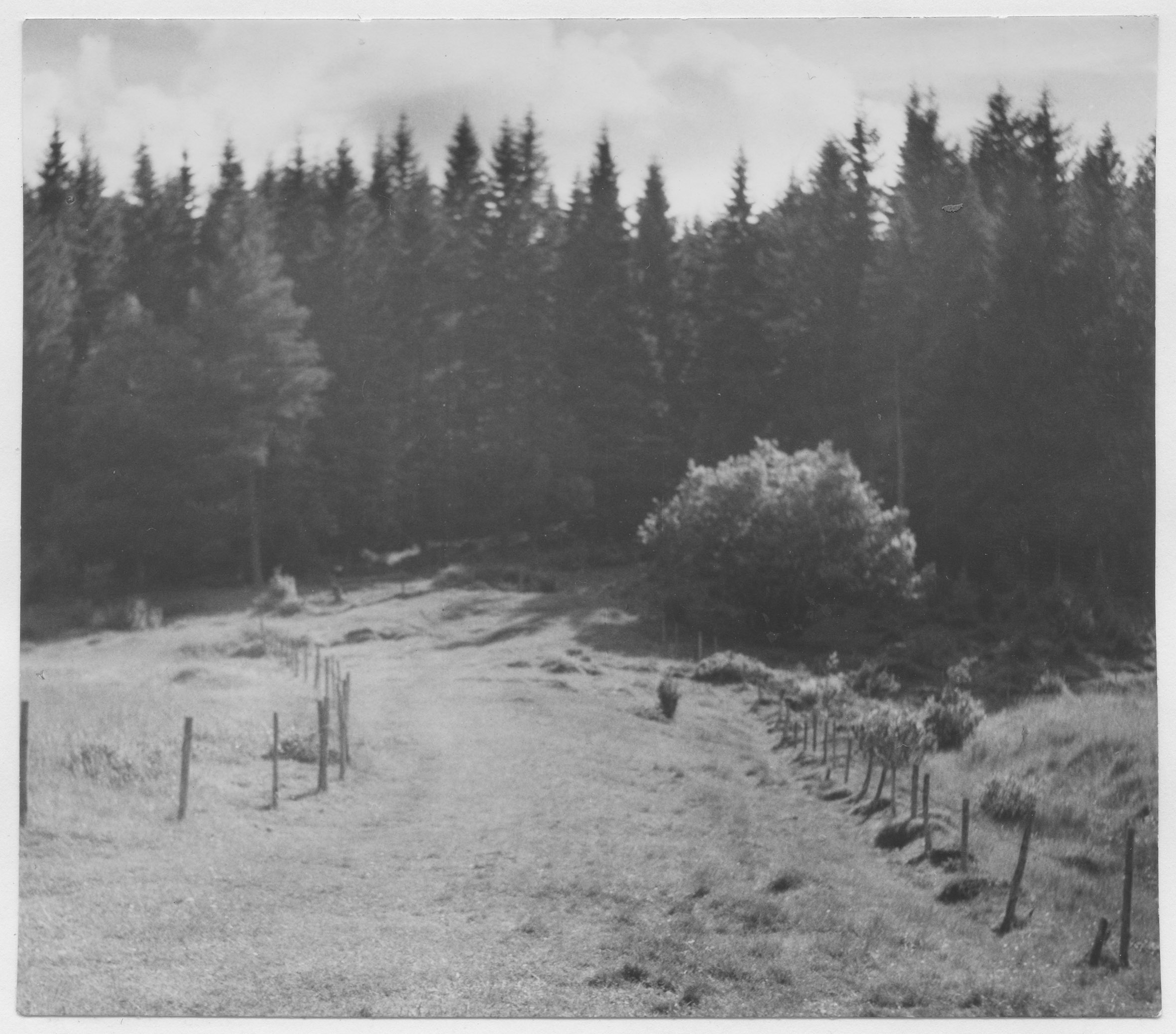 Beskrivning: Fägata med ljus hassel mot mörk granskog.