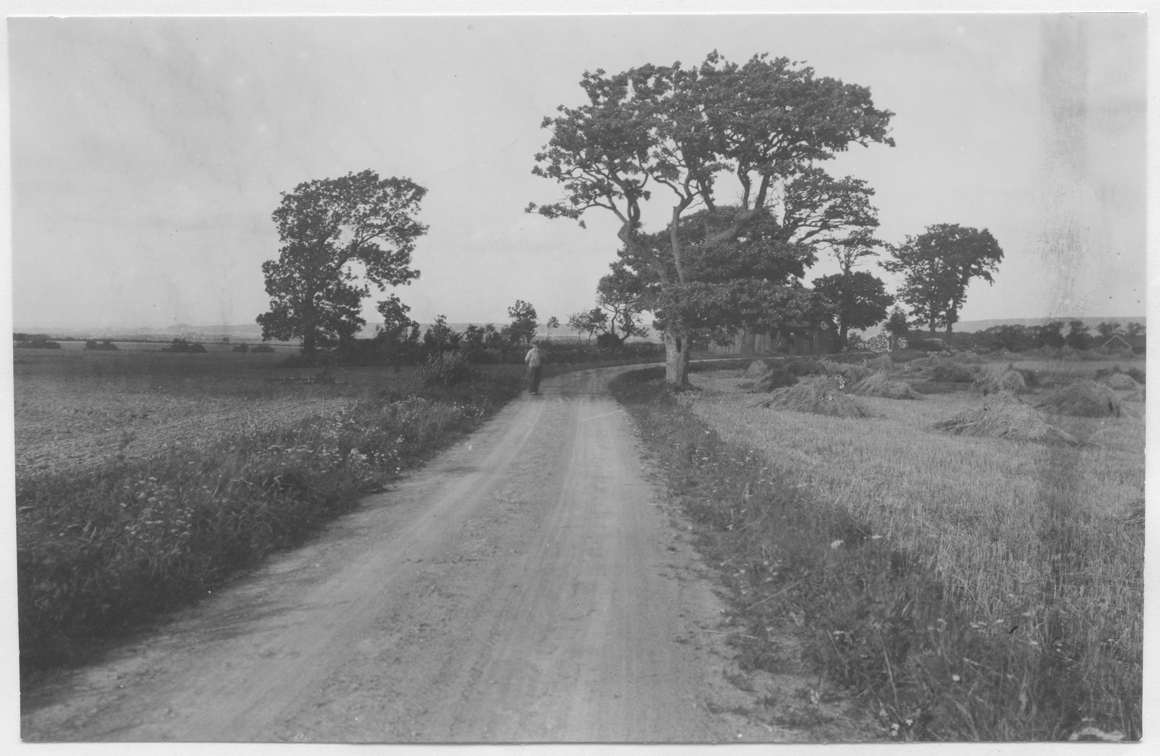 Beskrivning: Beskrivning: Landsvägens upprepat böjda linje visar skogsbygdens genom den nu försvunna lövskog. Obs. de kvarstående ekarna.