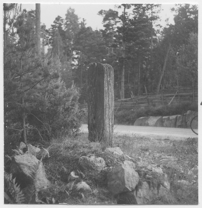 Beskrivning: Milstolpe av trä utmed gamla landsvägen i Gladhammar-Värkebäck.