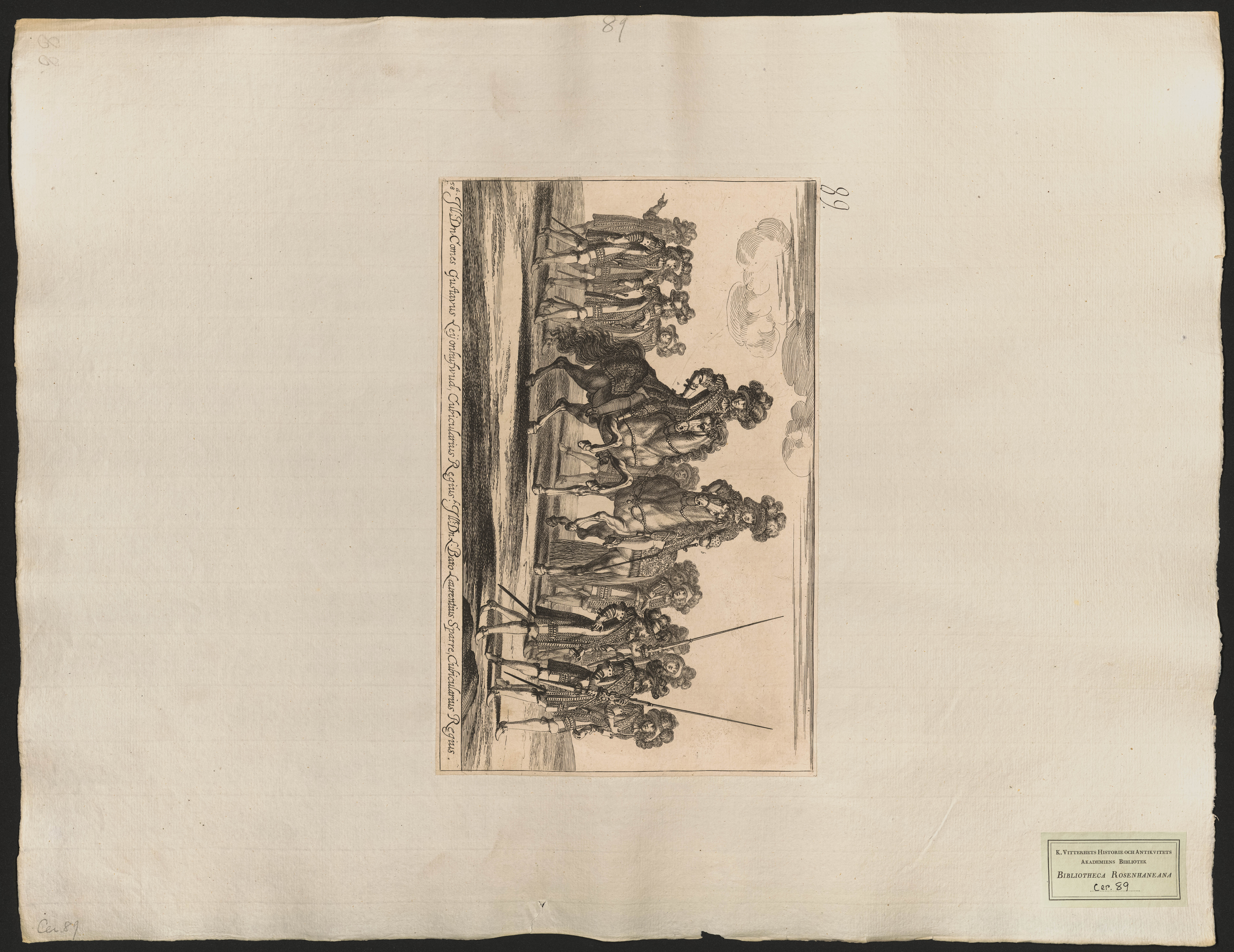 Beskrivning: 1 grafiskt bl. : Konungens marskalkar Gustav Leijonhufvud och Lars Sparre till häst, omgivna av fotfolk. Alla föreställande europeer.