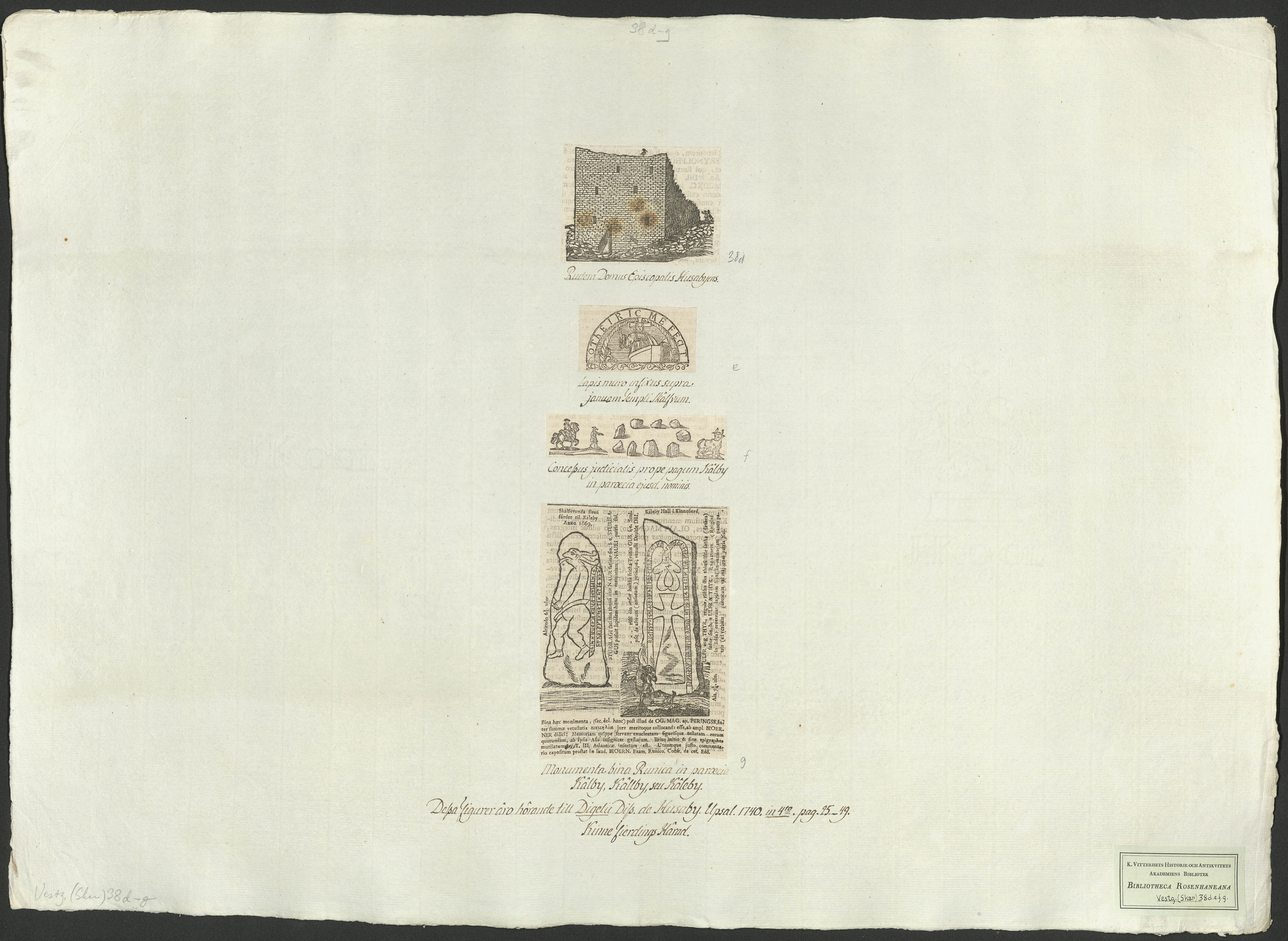 Concessus judicialis prope pagum Kälby, in paroecia ejusd. nominis. || Lapis muro infixus supra januam templi Skälfvum. || Monumenta bina runica in parœcia Kälby, Källby, seu Käleby. || Rudera domus episcopalis Husabyens.