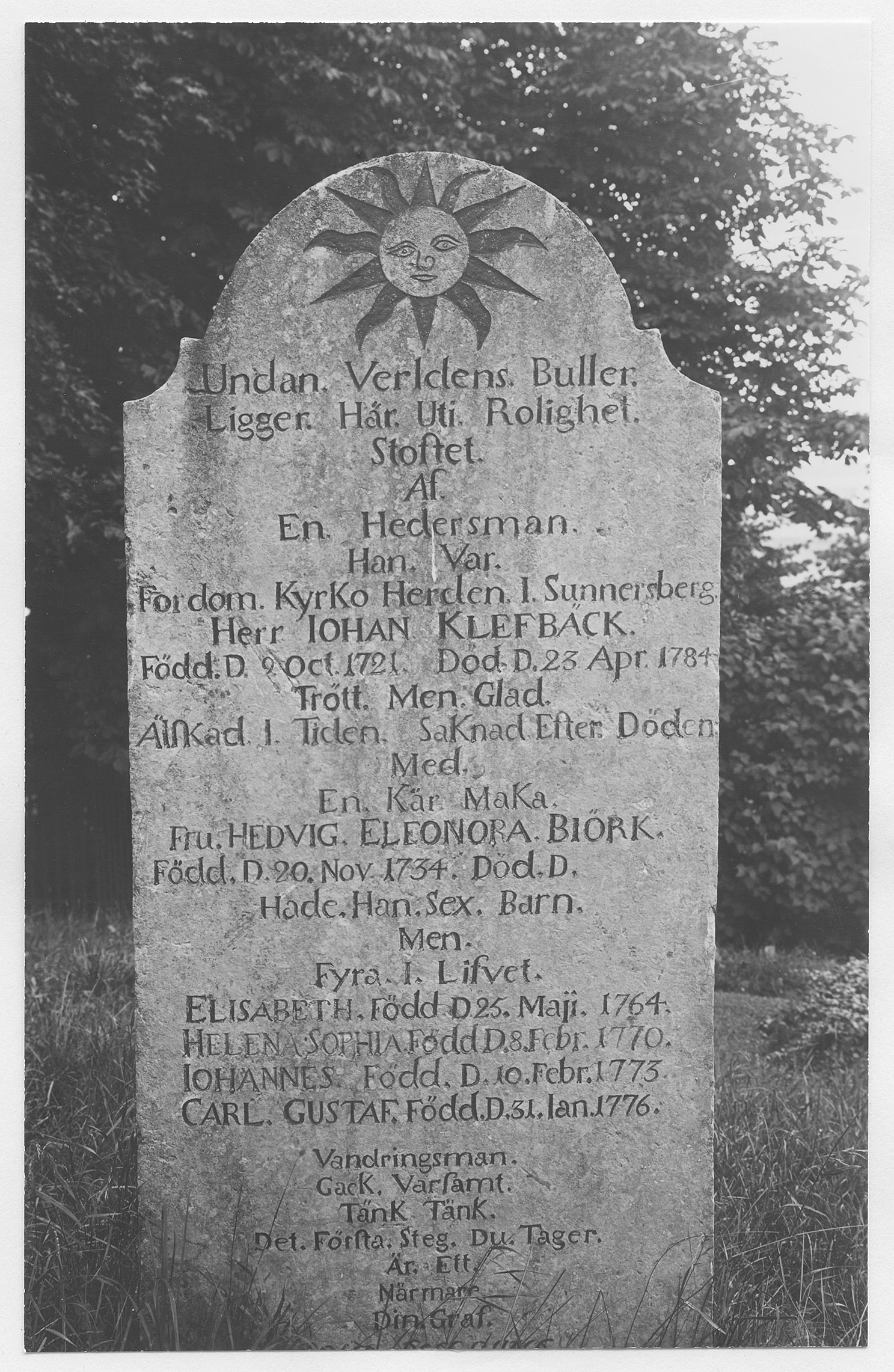 Beskrivning: Minnesvård över kyrkoherden Johan Klefbäck (1721-1784).