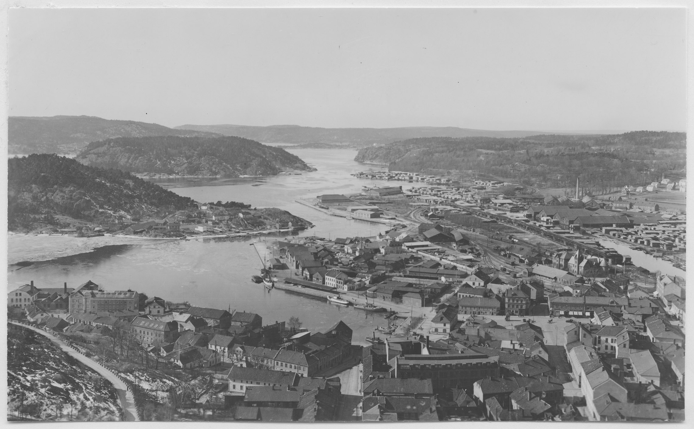 Beskrivning: Utsikt från fästningsberget över staden och Idefjorden.