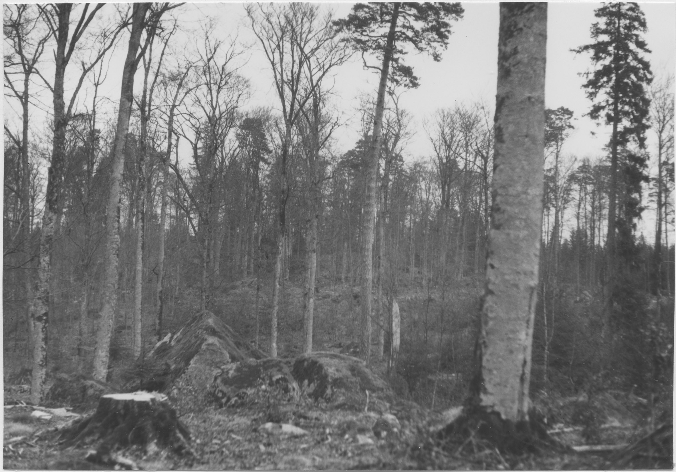 Beskrivning: Skogsmark med bok och tall.