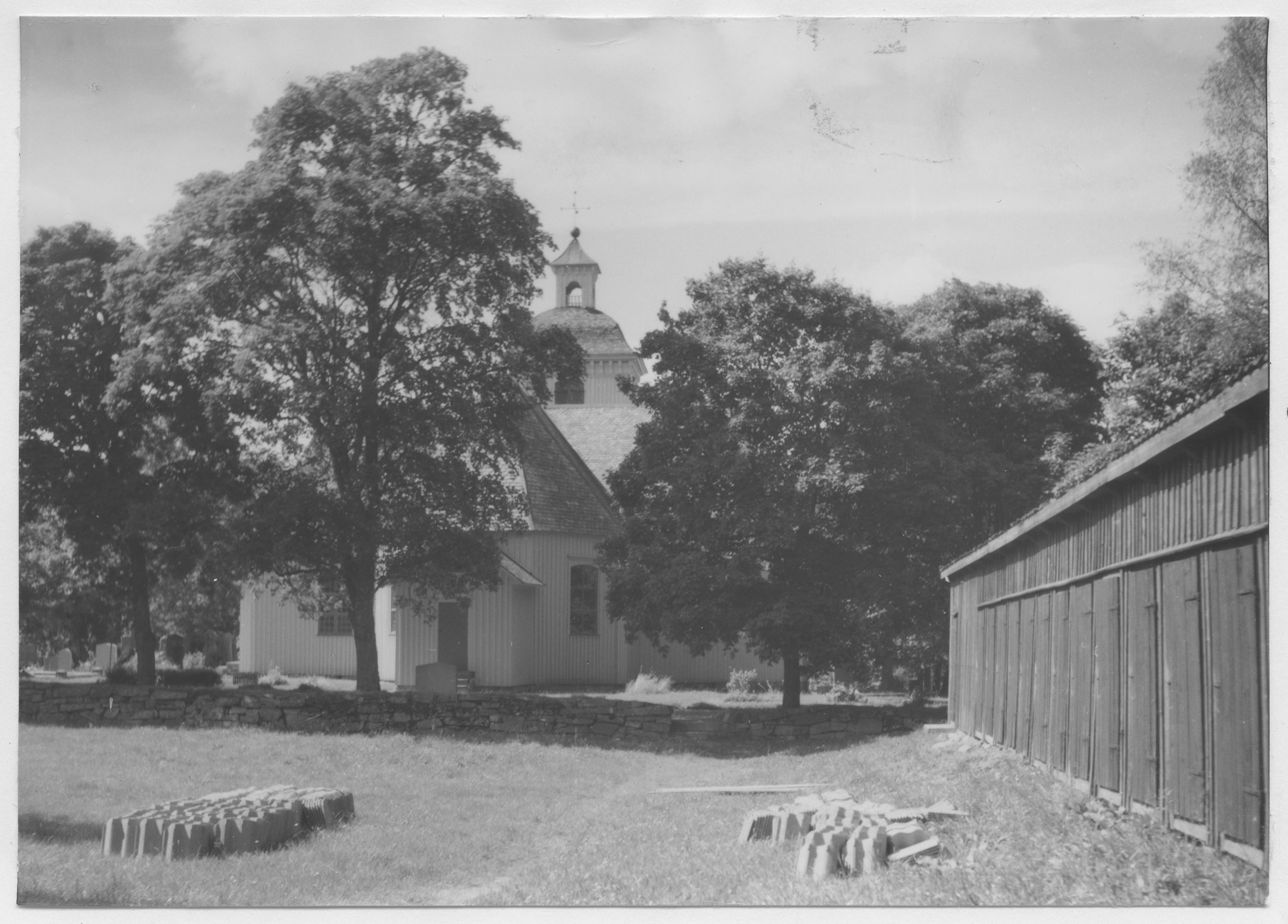 Beskrivning: Trä under skiffertak med tresidig koravslutning.