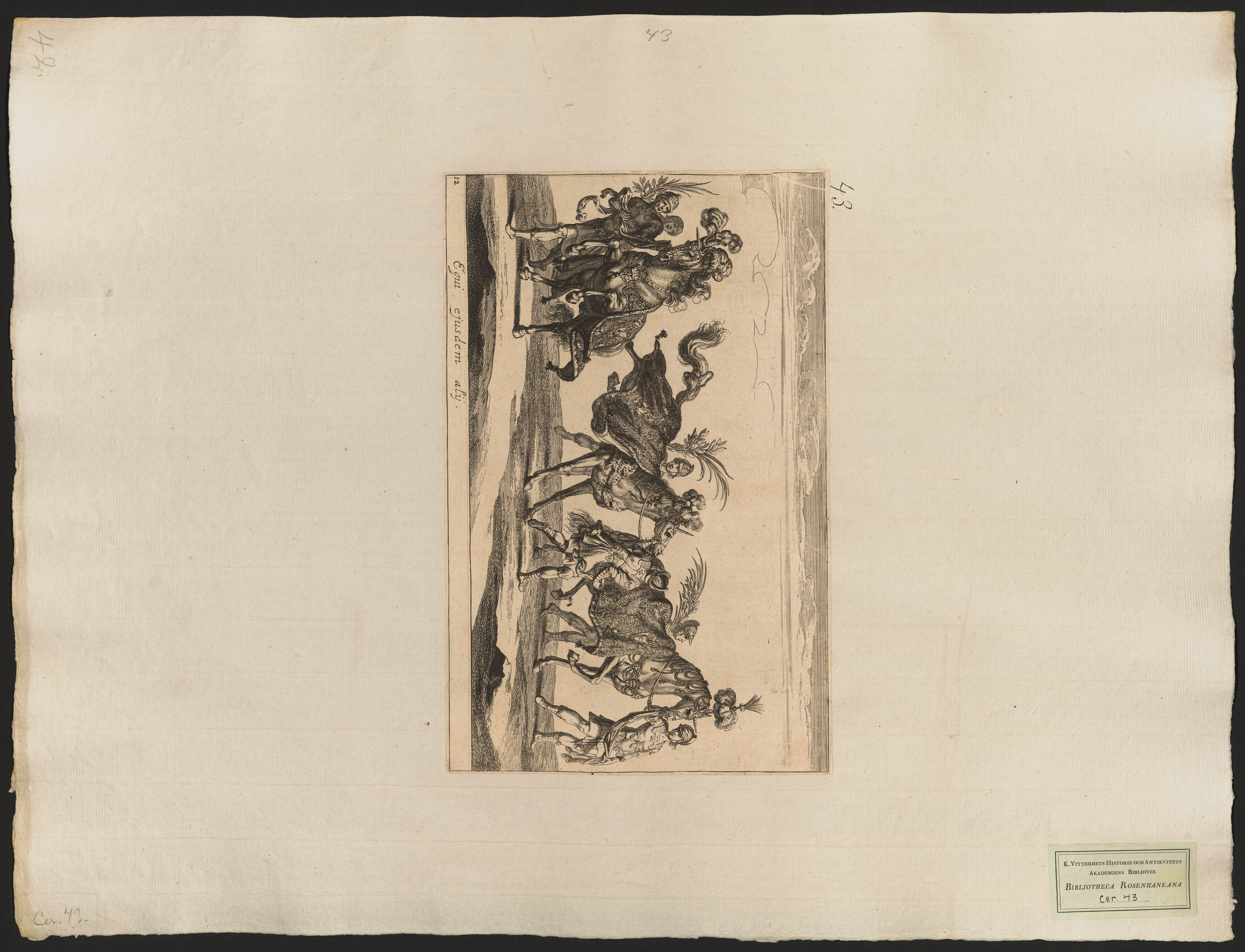 Beskrivning: 1 grafiskt bl. : Ryttare i romersk dräkt.