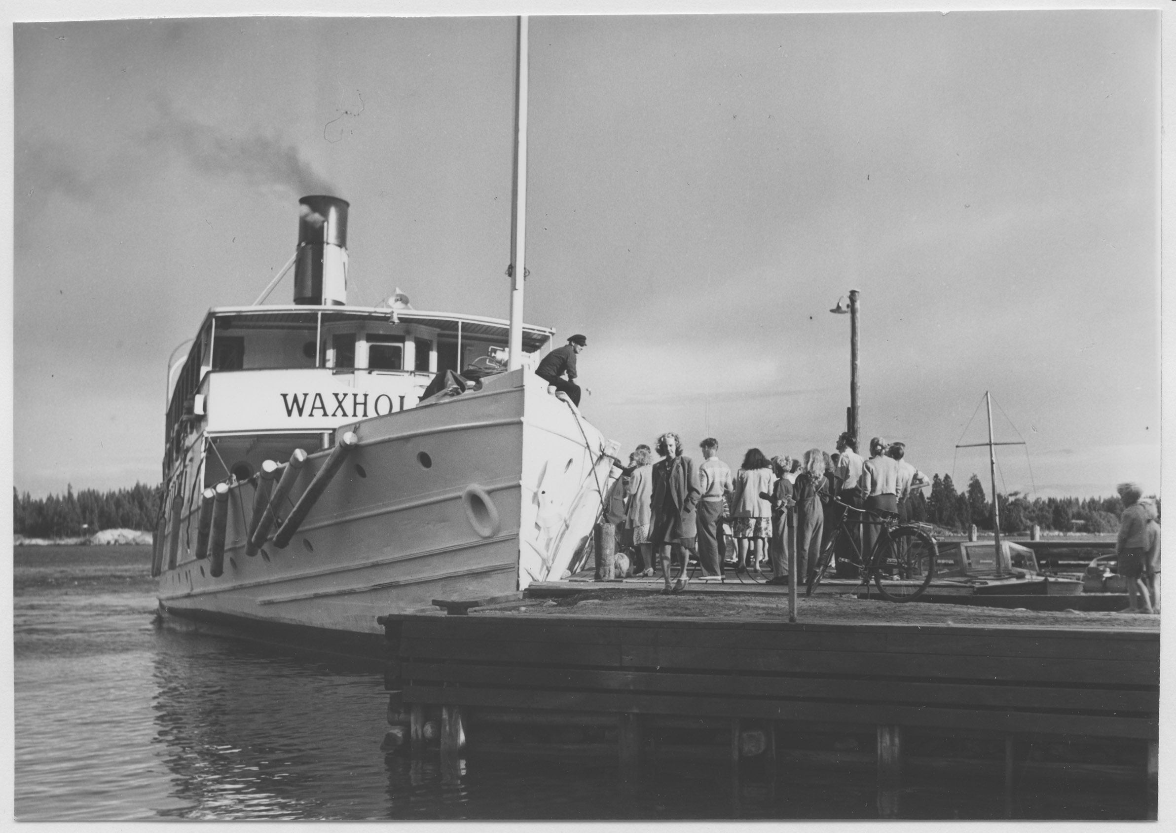 Beskrivning: Ångbåt från Waxholmsbolaget anlöper brygga.