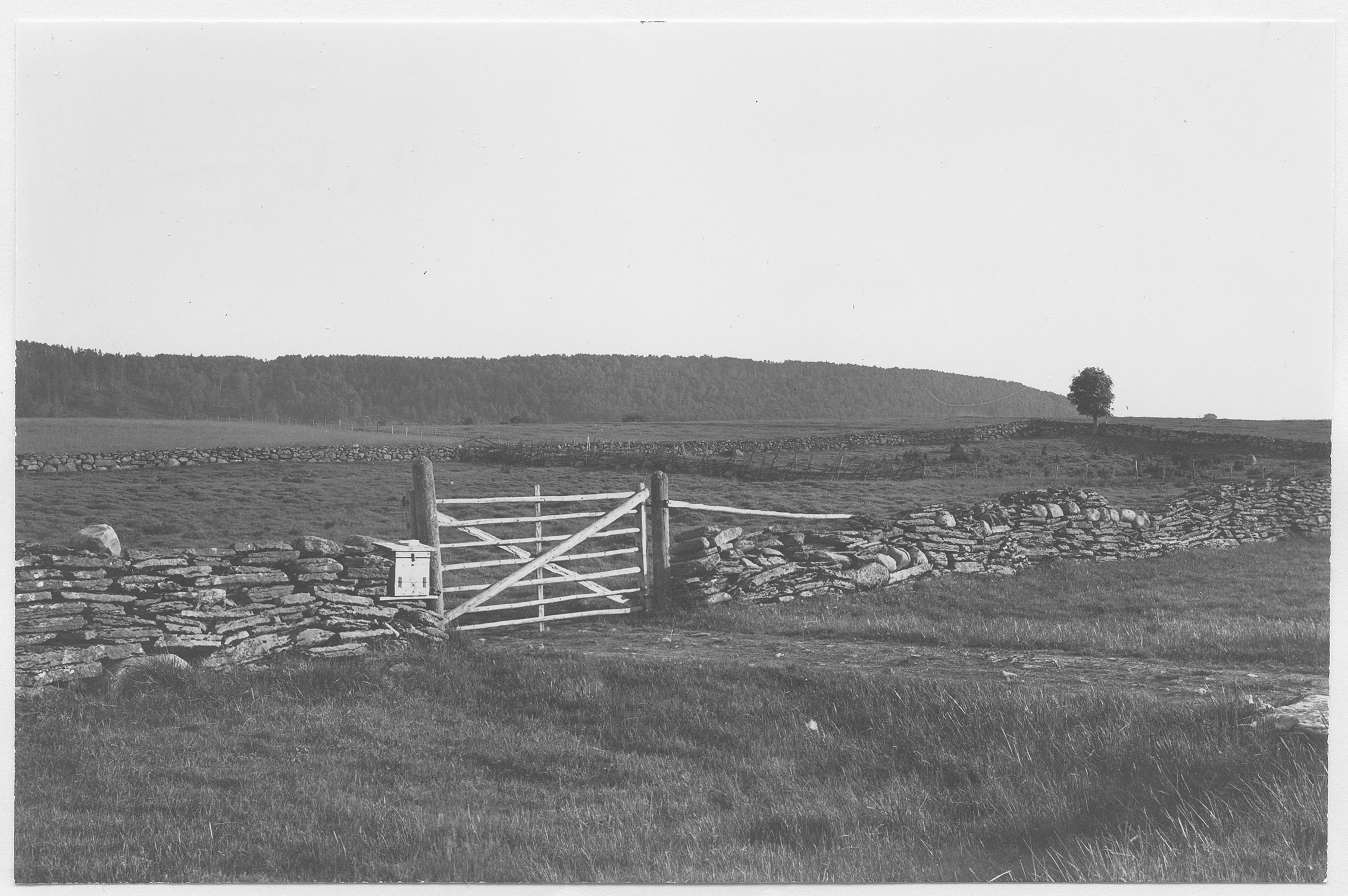 Beskrivning: Kalkstensgärdesgård. I fonden Plantaberget.
