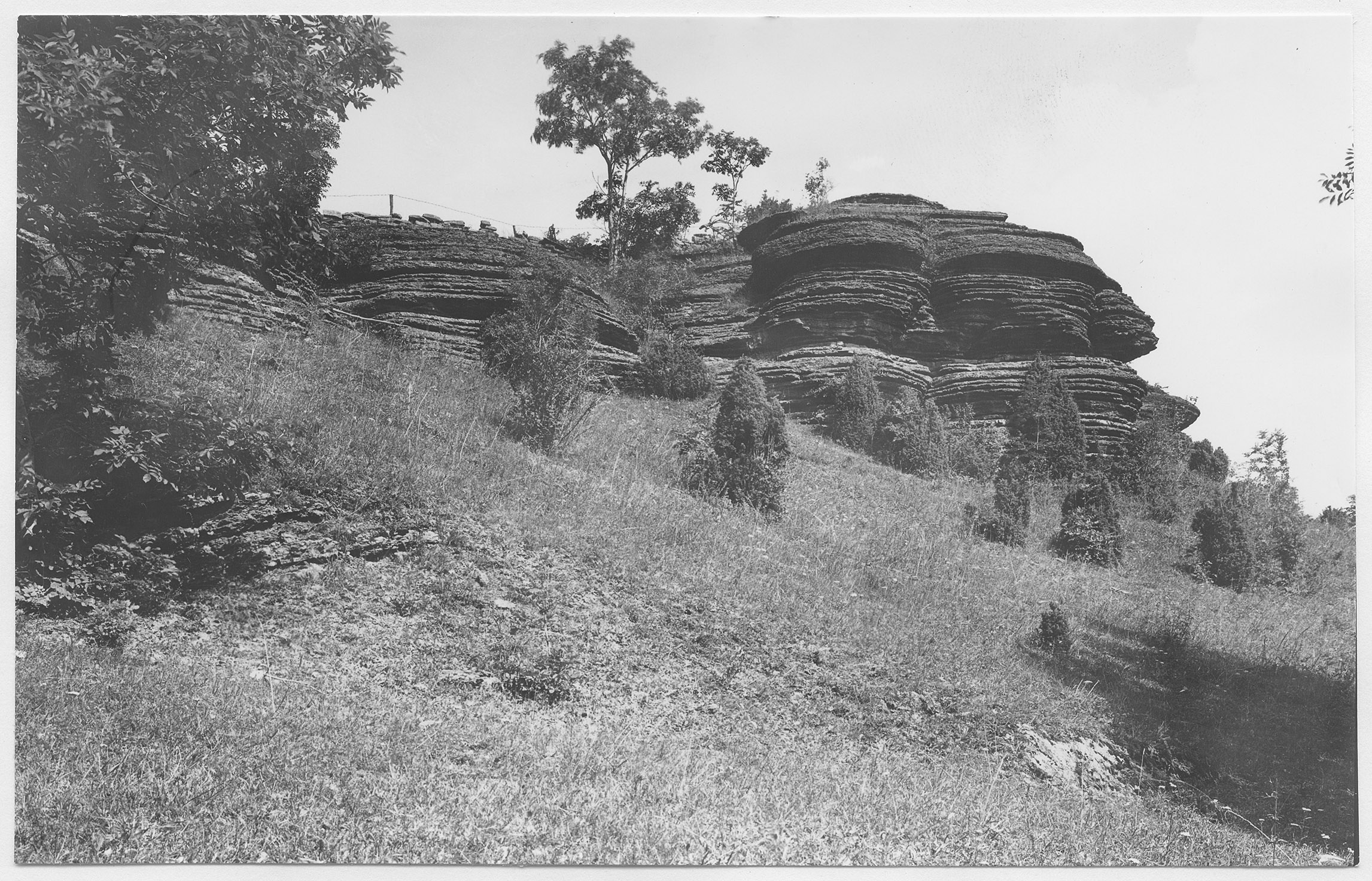 Beskrivning: Martorps klev. Kalkstensterrassen avslutas i Ö och S av lodräta stup med utsprång och stundom fristående pelare.