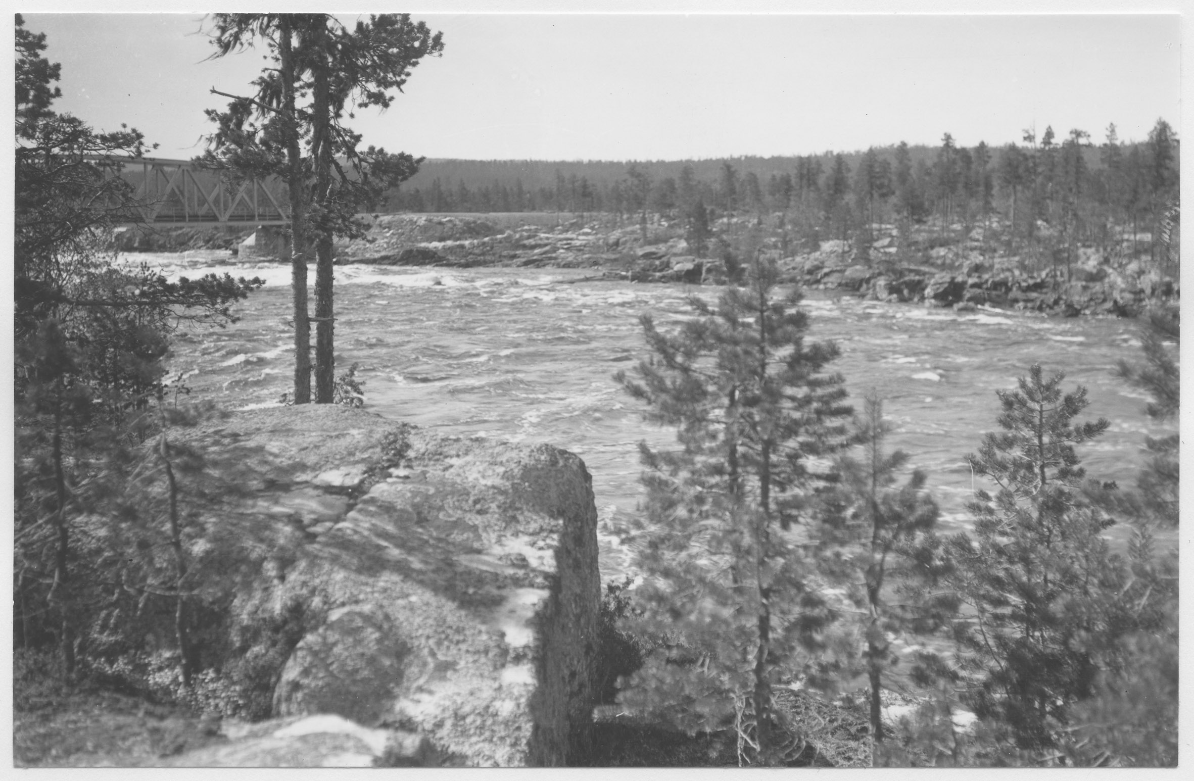 Beskrivning: Akkatsfallen i Lilla Luleälv. I bakgrunden järnvägsbron.