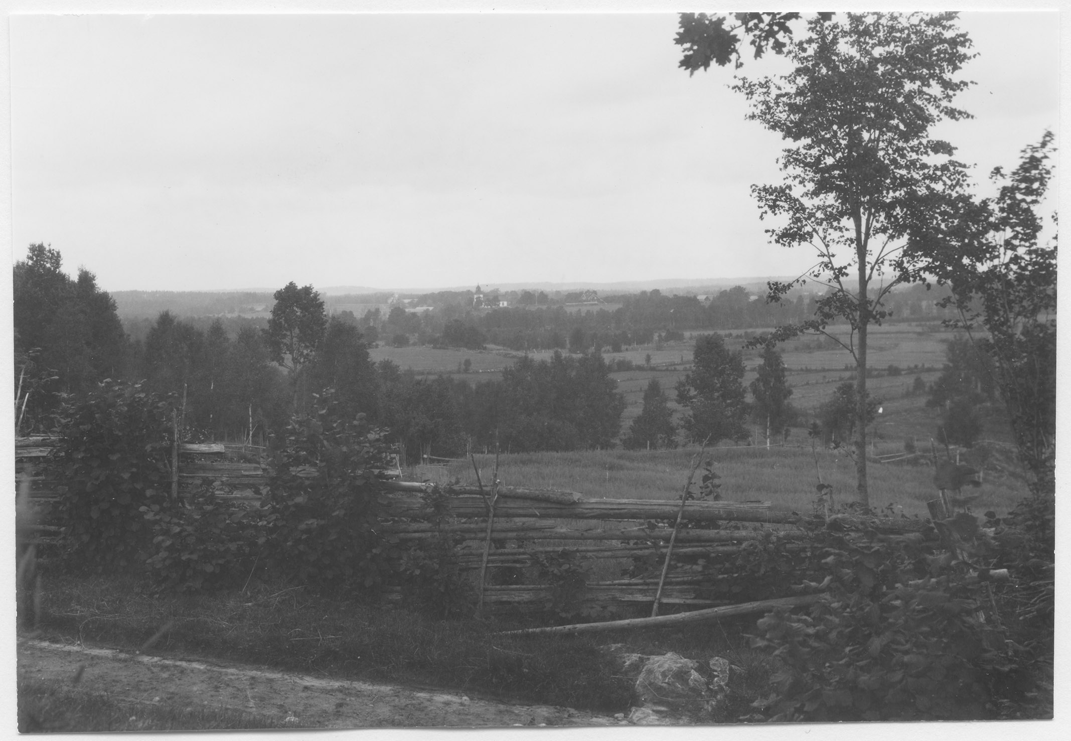 Beskrivning: Anmärkning (övrig): Bilden är inte daterad i arkivet och det går inte att utgå ifrån exempelvis negativnummer. Perioddateringen baseras på att det är den totala utsträckningen i tiden för de säkert daterade bilderna i samma arkiv. Beskrivning: Utsikt över Vetlandabygden med Bäckseda kyrka från terrängen söder om Bäckseda. Den rörliga, öppna terrängen söder om Vetlanda tecknar ett leende, uttrycksfullt landskap