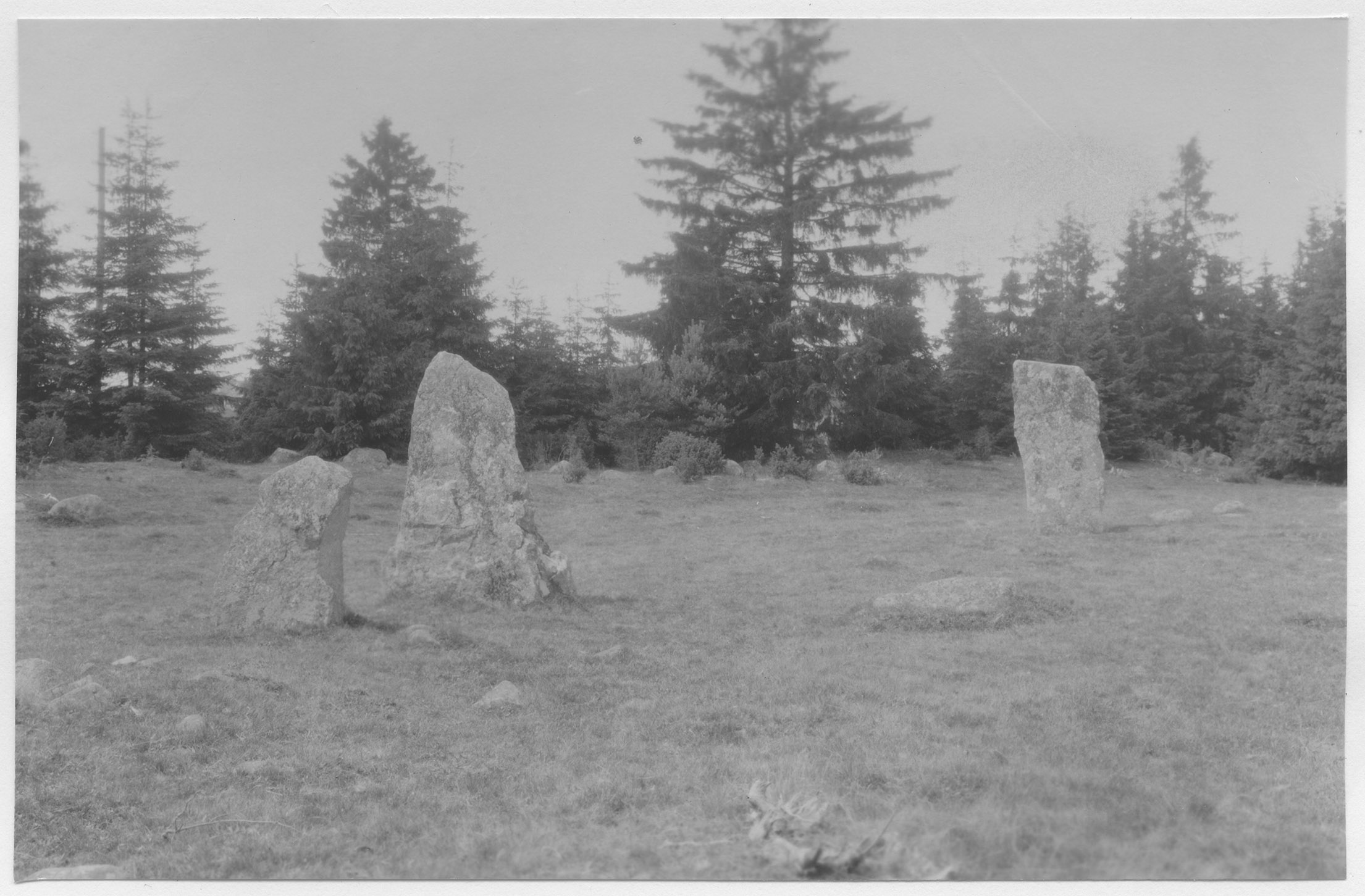 Beskrivning: Stensättning invid vägen Växjö-Ingelstad. På området finns flera gravkummel, 2 runda och ett stort ovalt, stensättningar och fallna bautastenar. På bilden 3 bautastenar, de två längst till höger av granitflis, samt c:a 7 meter hög ormgran.