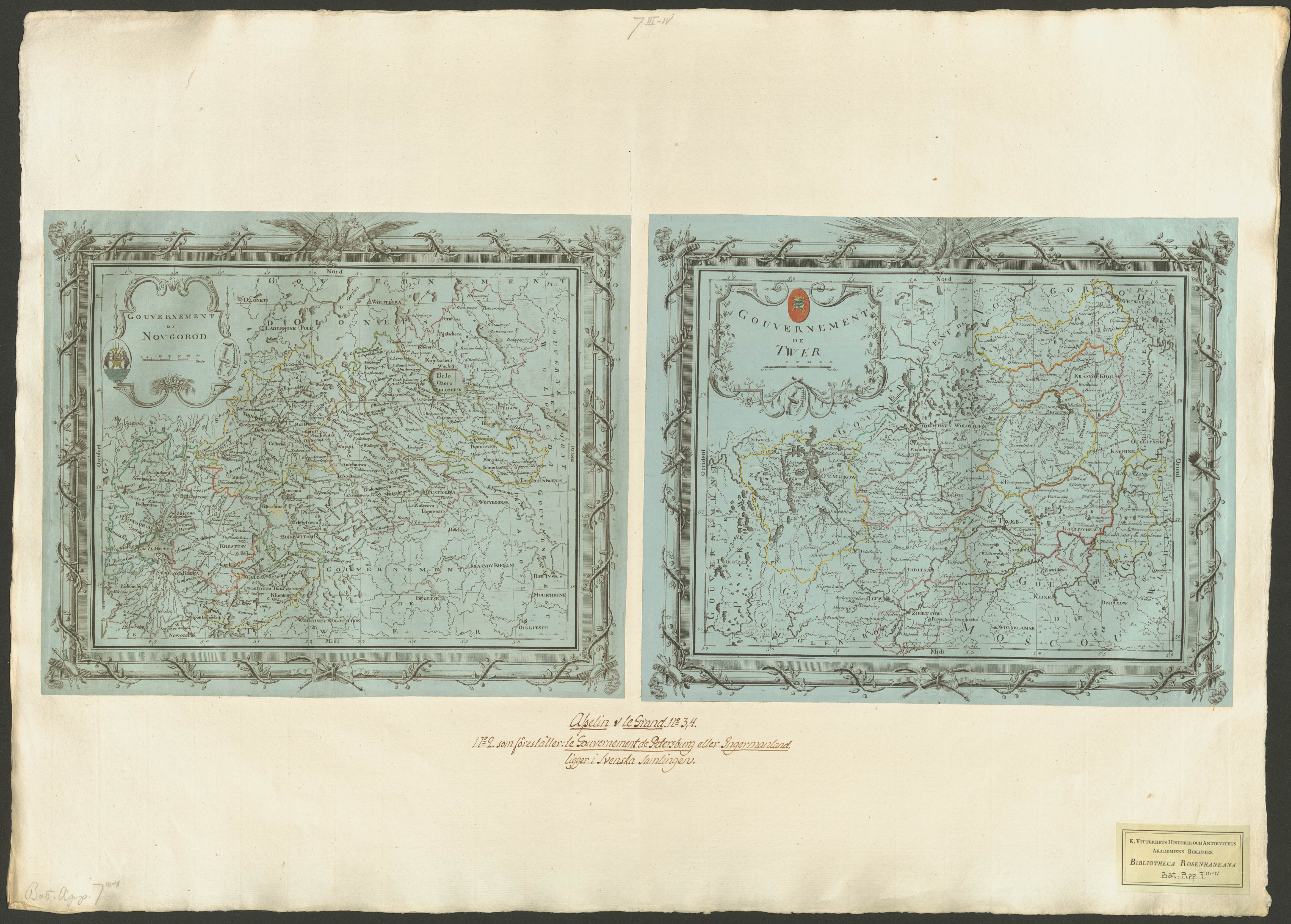 Beskrivning: 1 karta : Topografisk karta på blått papper. Positionsangivelser i lat-long. Skalstreck i verst. Ungefärlig skala 1:1 600 000.;Twer län. Administrativa gränser kolorerade. Påskrift: "Anselin et le Grand No 3, 4. No 2 som föreställer le Gouvernement de Petersburg eller Ingermanland ligger i Svenska samlingen."