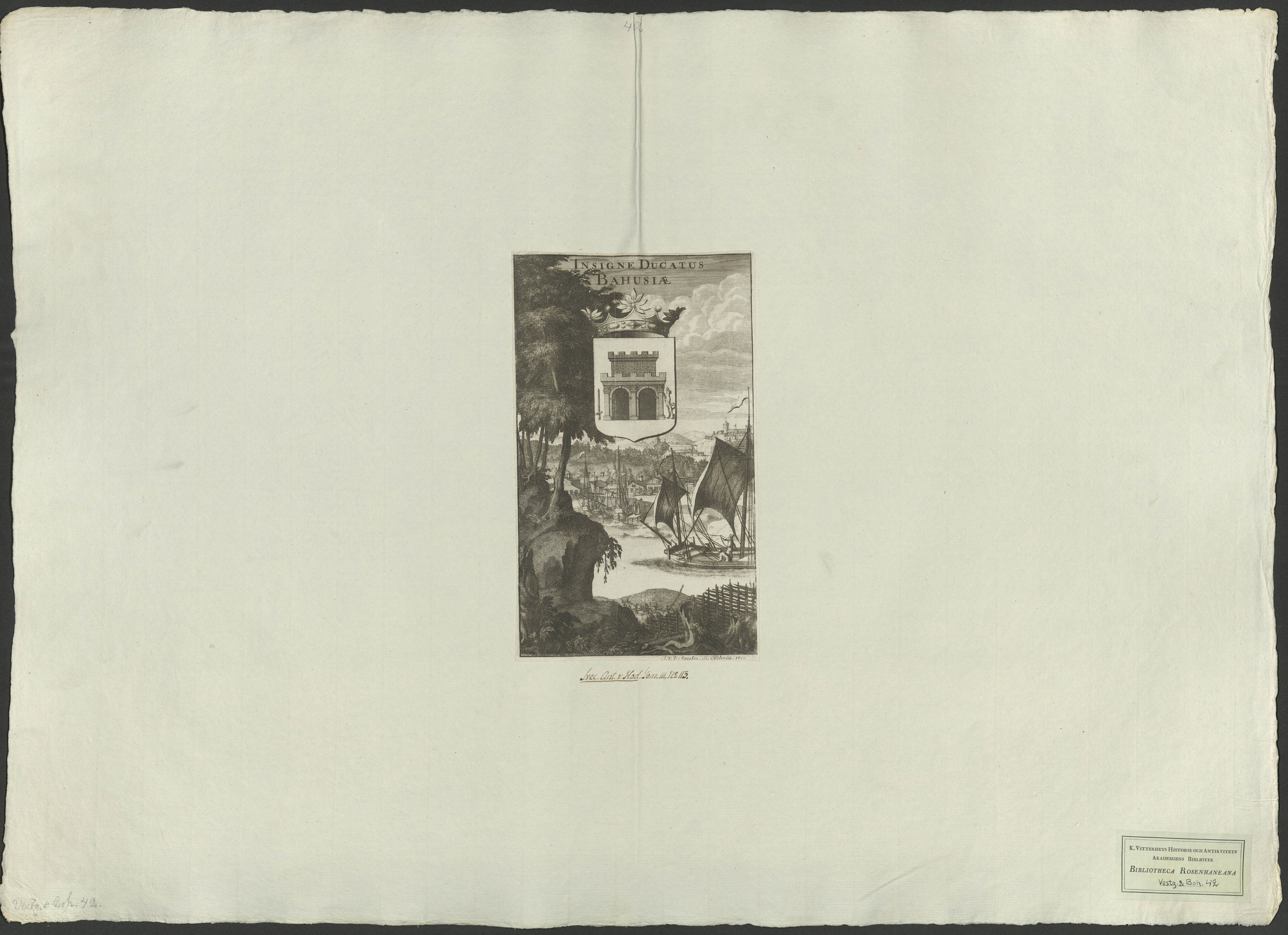 Beskrivning: 1 tryckt ark : J. V. D. Aveelen Sc. Holmiæ 1713. Påskrift: "Svec. Ant. & Hod. Tom. III. No 113."