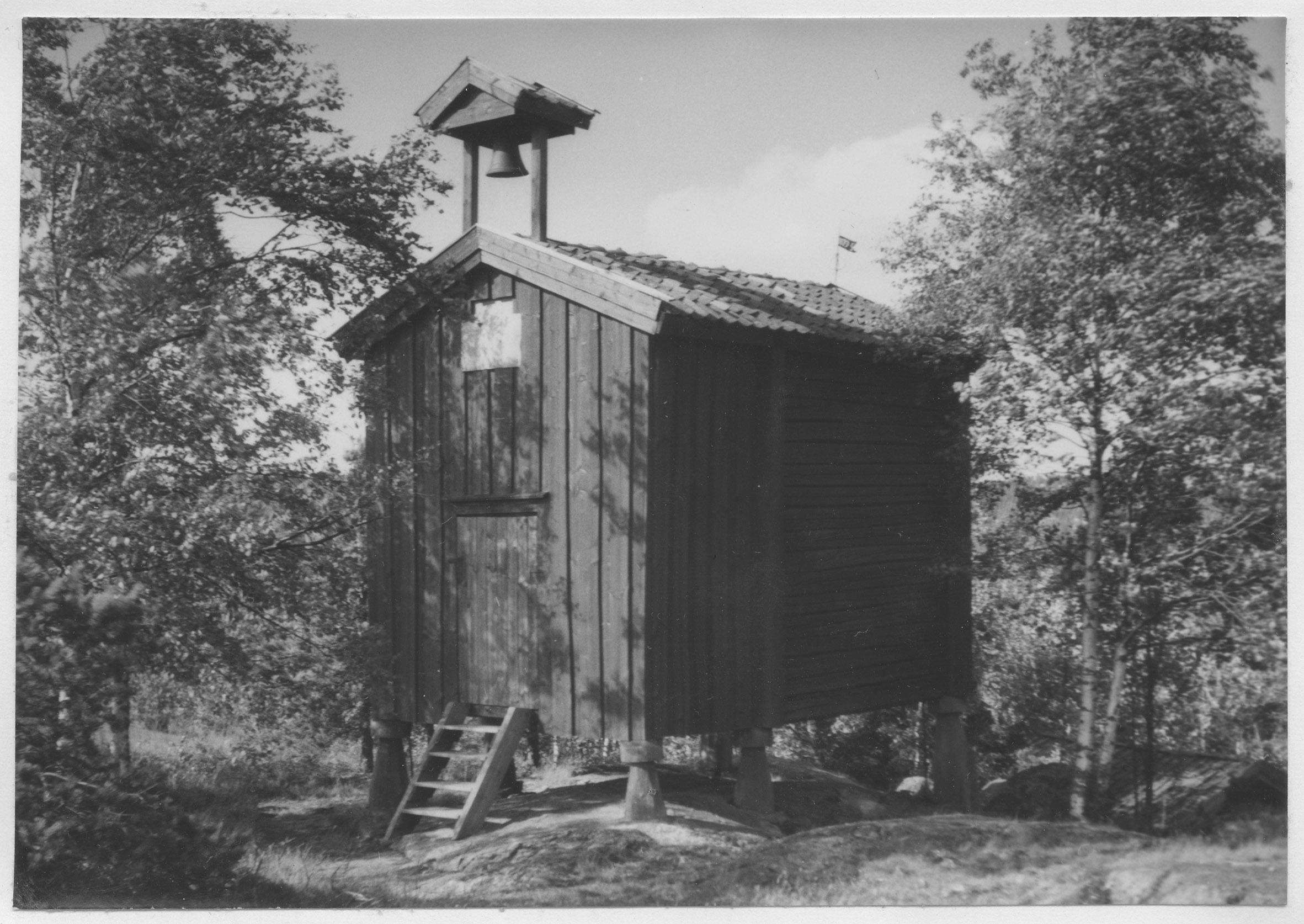 Beskrivning: Stolpbod med vällingklocka.