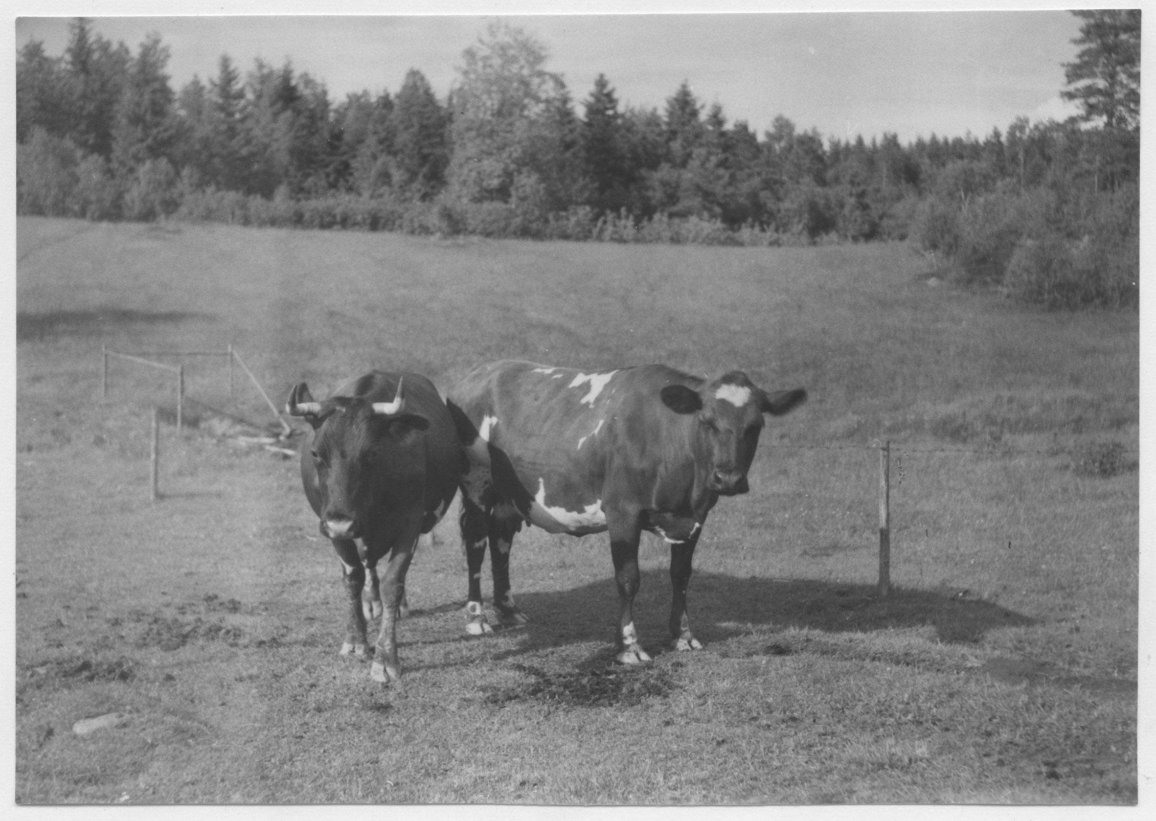Beskrivning: Bod och kor (1 behornad, 1 kullig).