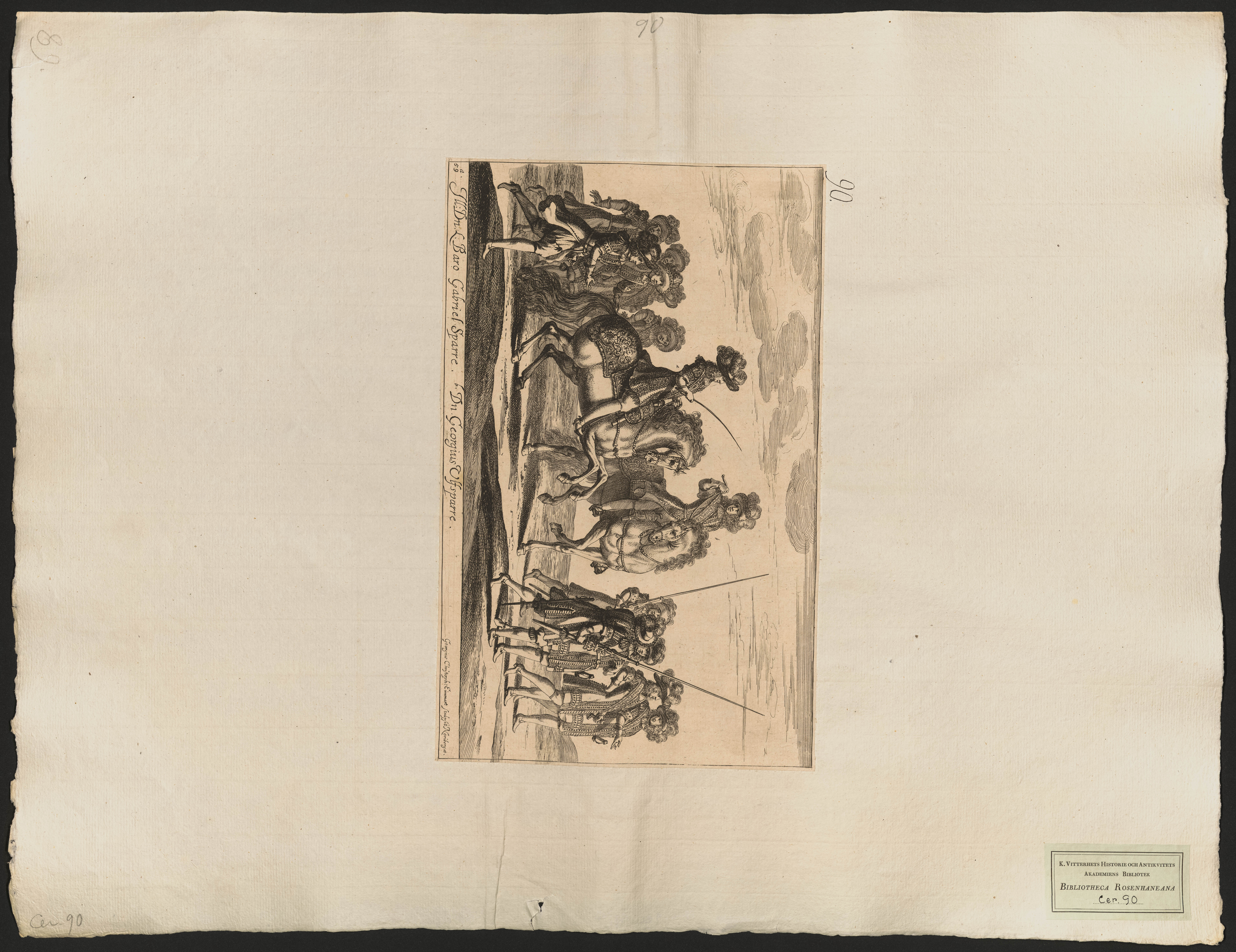 Beskrivning: 1 grafiskt bl. : Gabriel Sparre och Göran Ulfsparre till häst, omgivna av fotfolk. Alla föreställande europeer. Georgius Christoph: Eimmart sculpsit Noribergæ