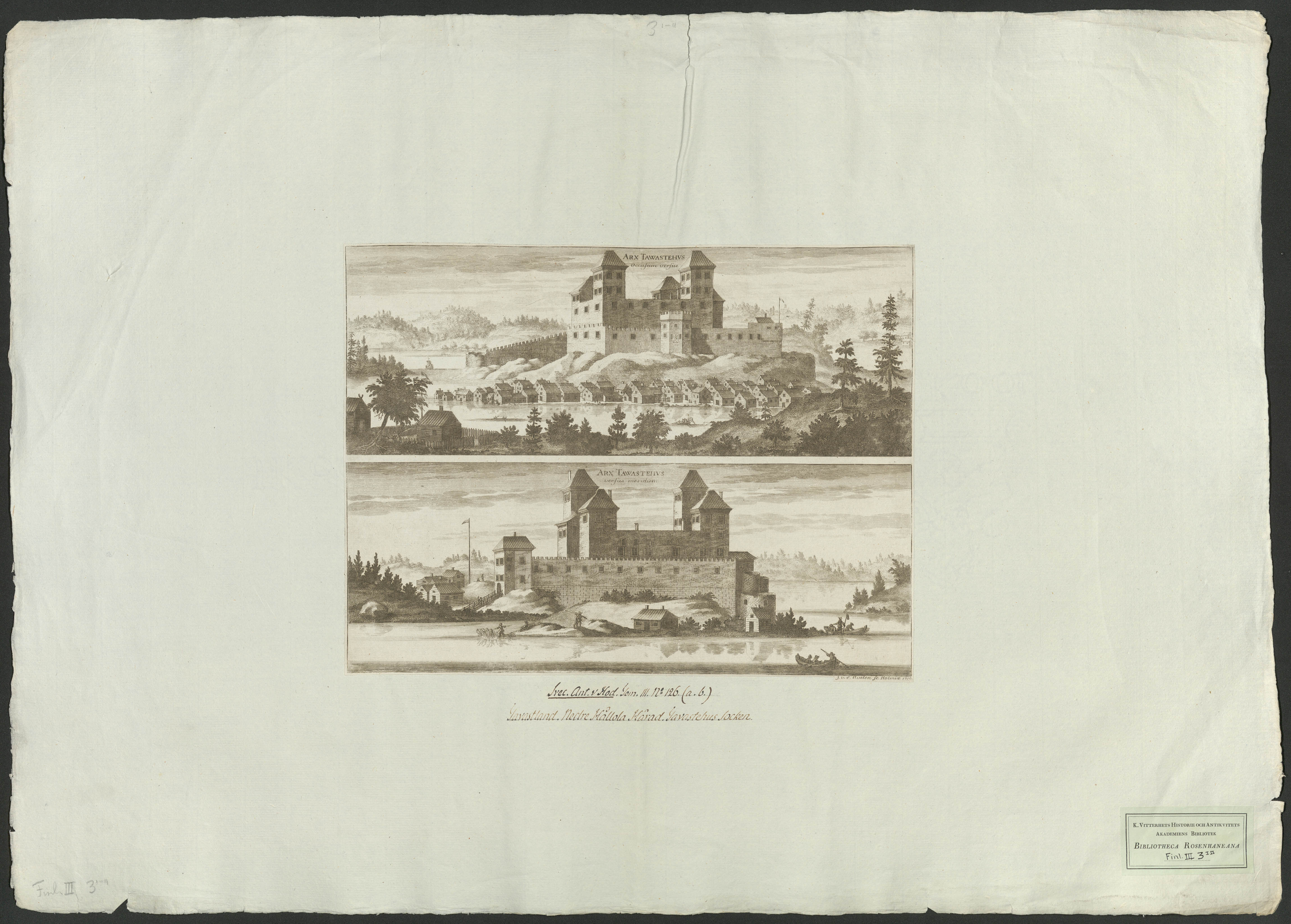 Beskrivning: 1 tryckt ark : j. v. d. Aveelen sc. Påskrift: "Svec. Ant. & Hod. Tom. III. No 126(a,b). Tavastland. Nedre Hållola härad. Tavastehus socken."