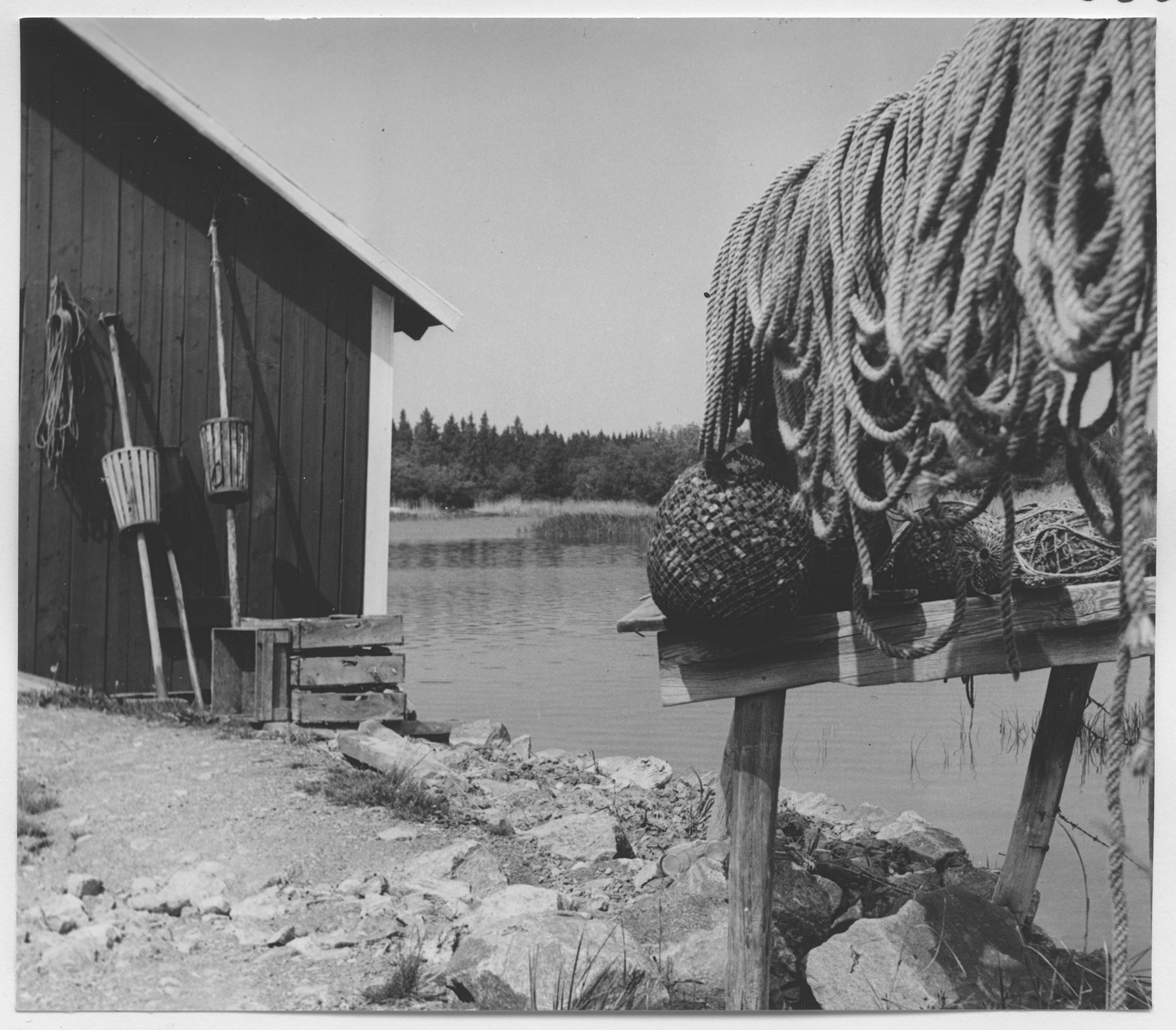 Beskrivning: Beskrivning: Fiskehamnen med sjöbodar och redskap.