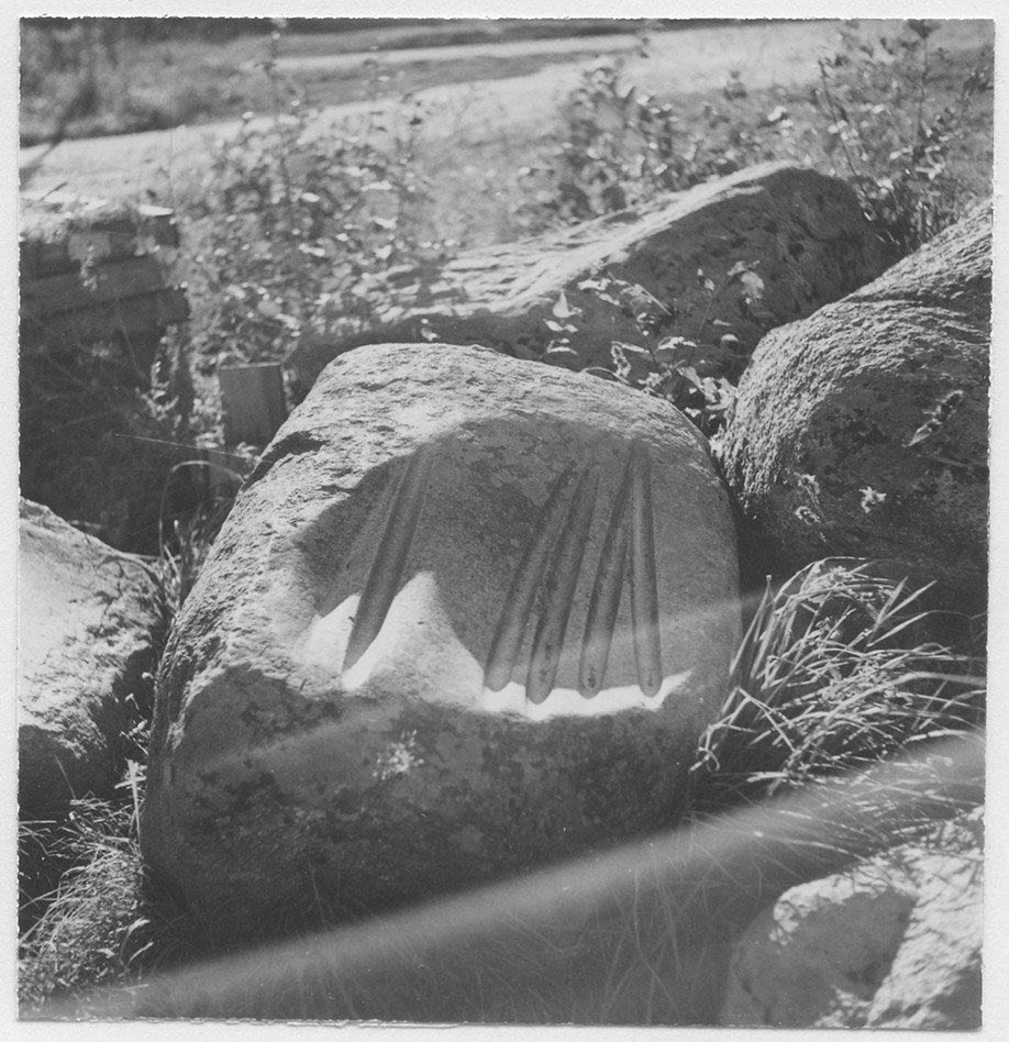 Beskrivning: Vädstenar med sliprännor. Användes för att slipa de brynstenar som i sin tur användes för att skärpa liarna för slåttern.