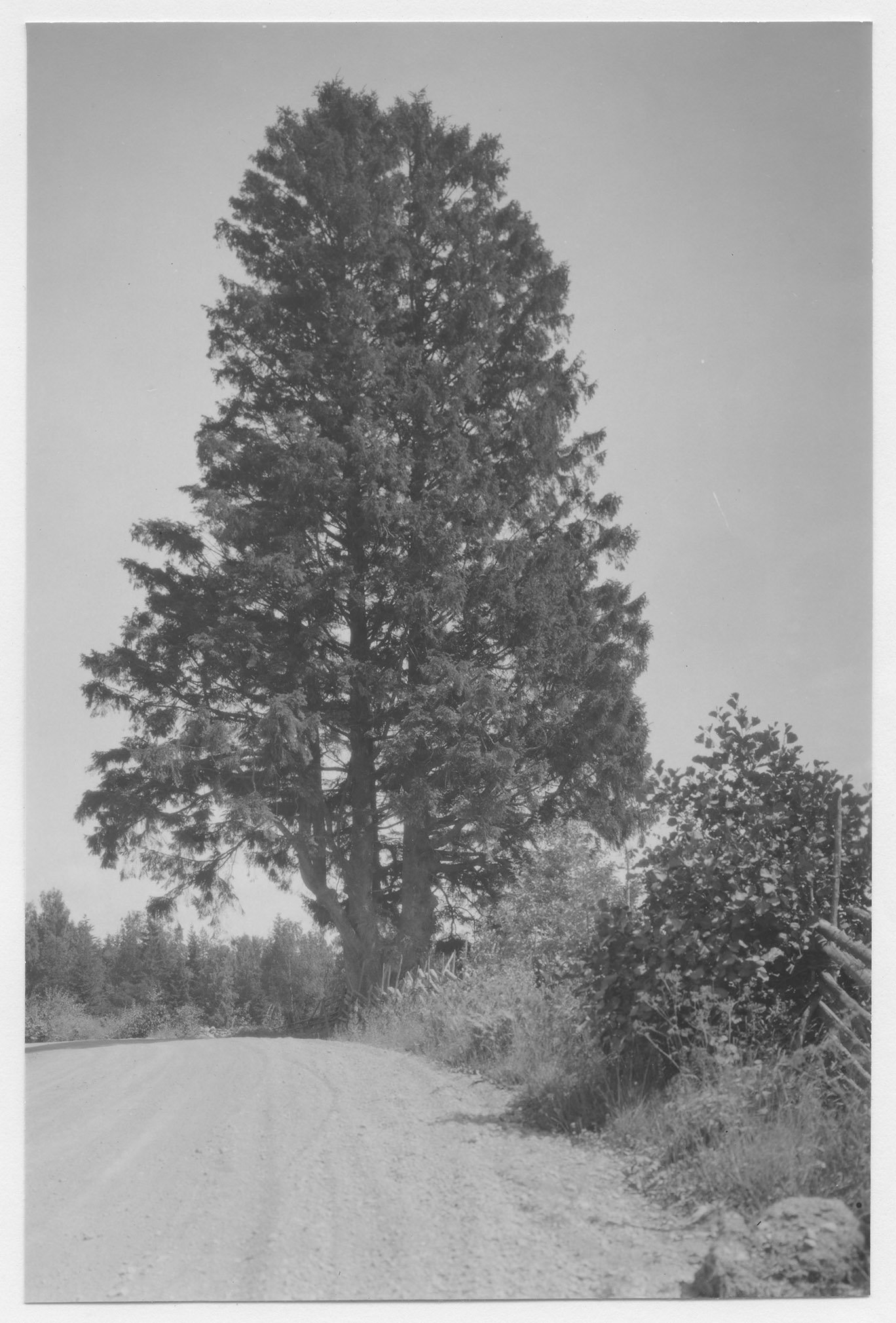 Beskrivning: Den väldiga granjätten invid landsvägen. Höjd c:a 20 meter. 3 meter från marken delar sig stammen i 5 grova sekundärstammar. Bör skyddas som naturminne.