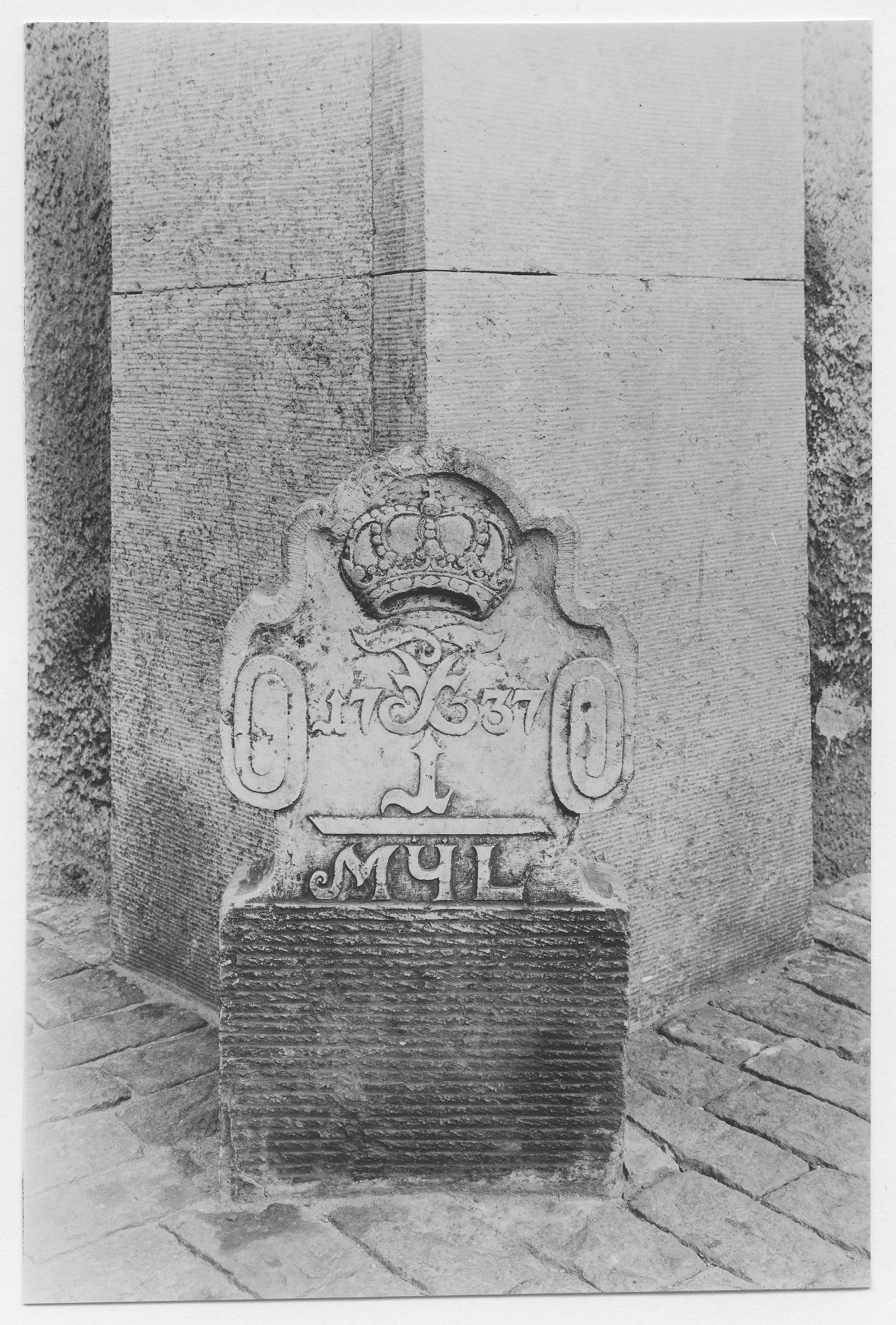 Beskrivning: Milsten i hörnet av Dahmska huset, märkt 1737.