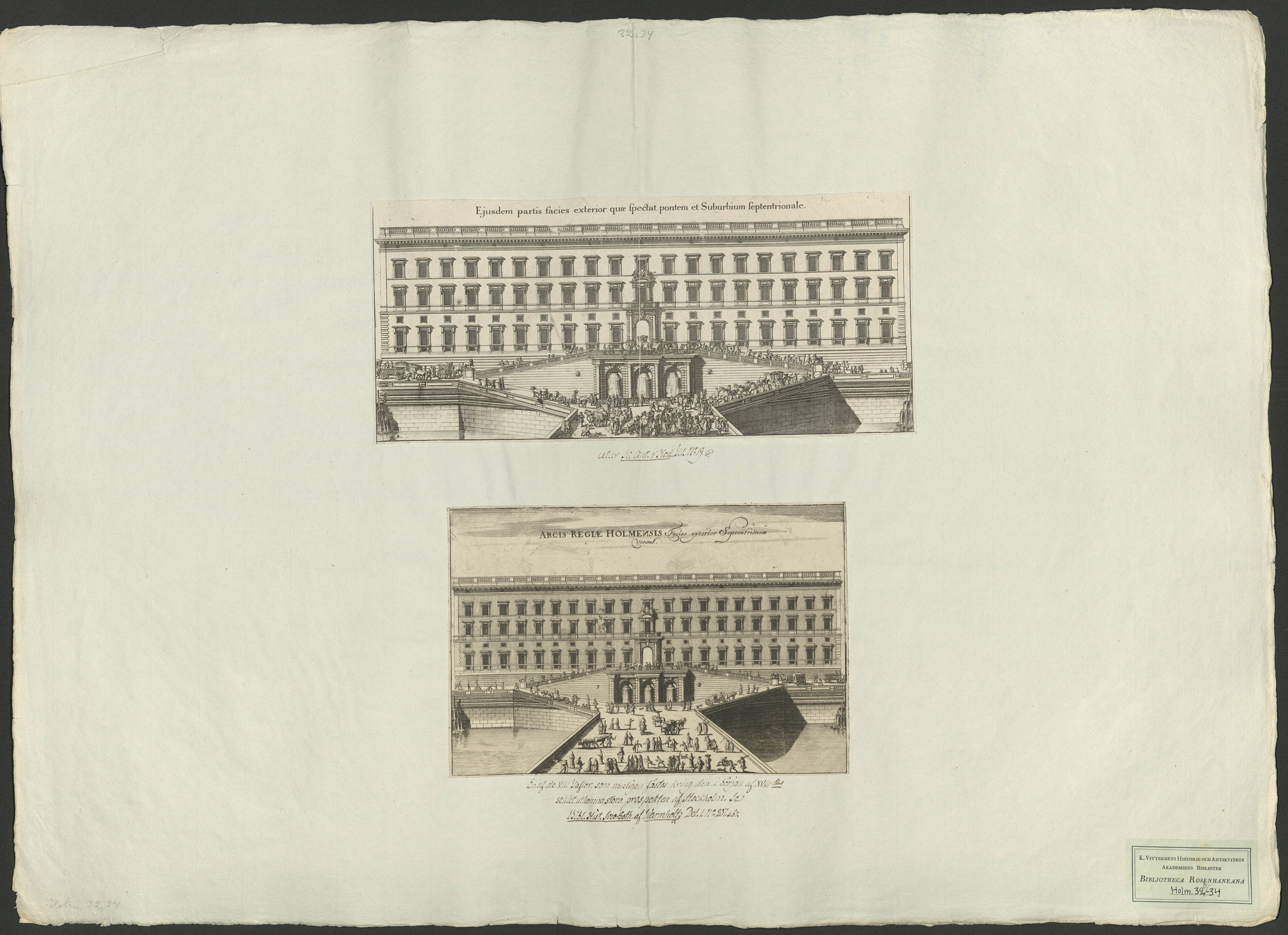 Beskrivning: 1 grafiskt bl. : 1 tryckt ark : Stockholms slott från Norrbro. Påskrift: "En af de VIII taftor, som vanligen fästas kring den i början af XVIII:de seklet utkomna stora prospekten af Stockholm. Se Bibl. Hist. Sveo-Goth af Warmholtz. Del I, no 207, 2. 67." Påskrift: "utur Sv. Ant. & Hod. T. I. No 19(b)."