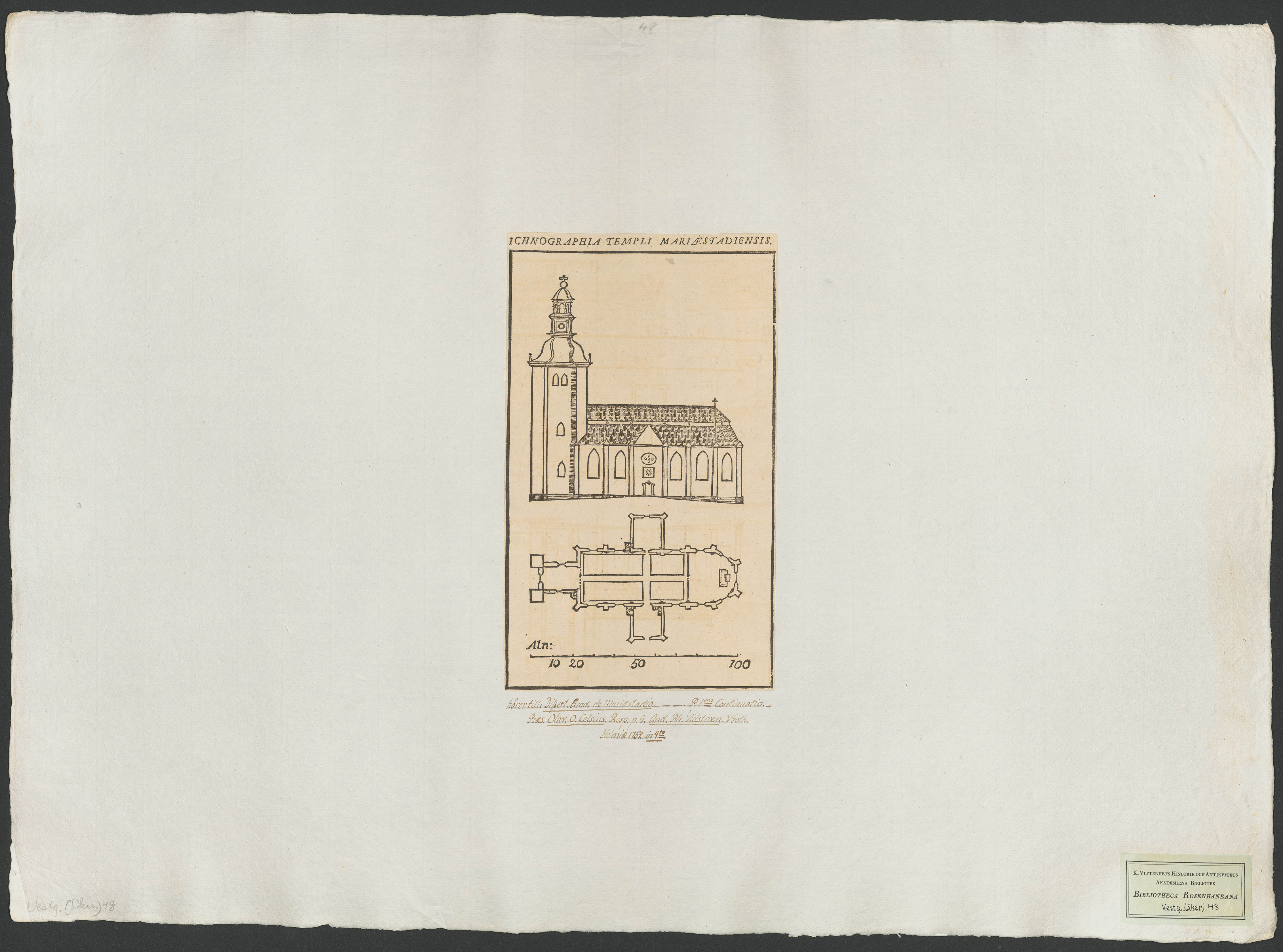 Beskrivning: 1 grafiskt bl. : Påskrift: "hörer till: Dissert. Acad. de Mariæstadio P. 1oris Continuatio. Præs. Olav. O. Celsius. Resp. p. g. And. Ph. Tidstroem. Holmiæ 1752 ... in 4to"
