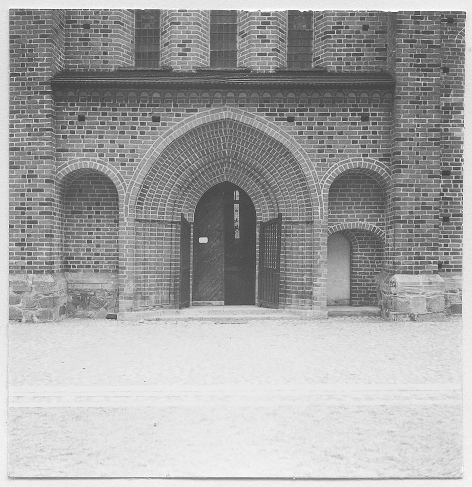 Beskrivning: Mariakyrkans västfasad med huvudportalen.