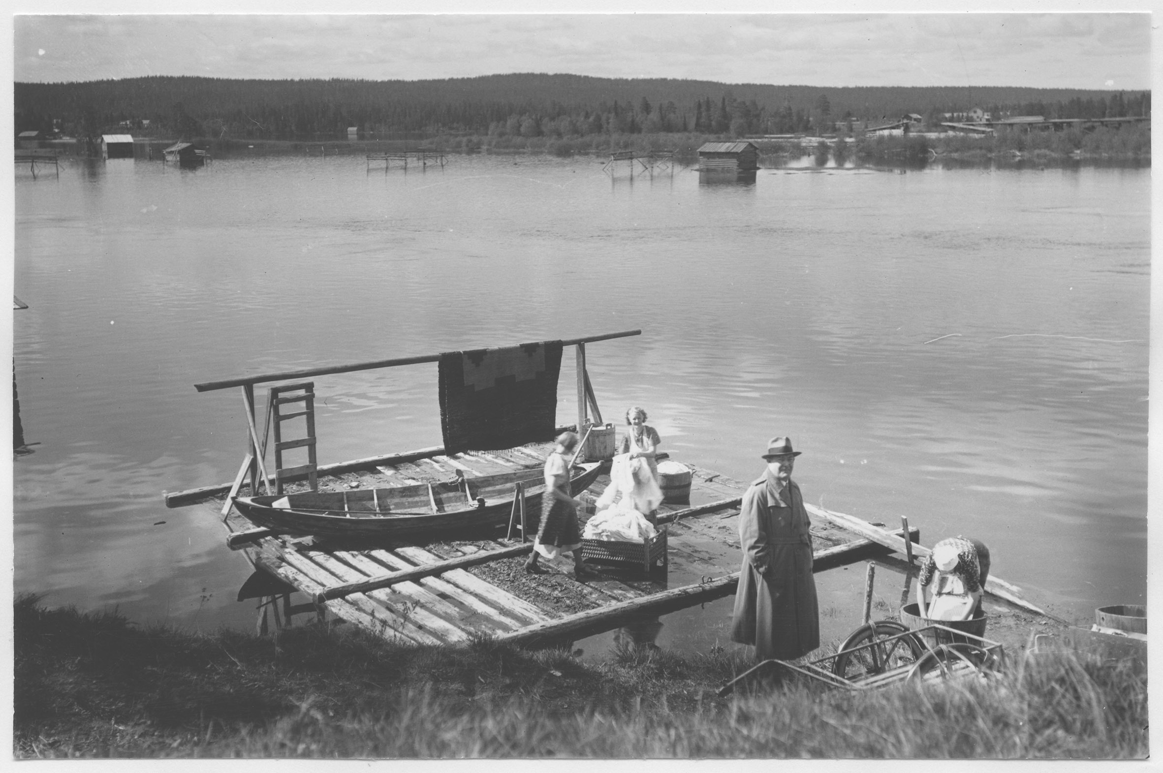 Beskrivning: Sorsele kyrkby. Klädtvätt på timmerflotte i Vindelälven.