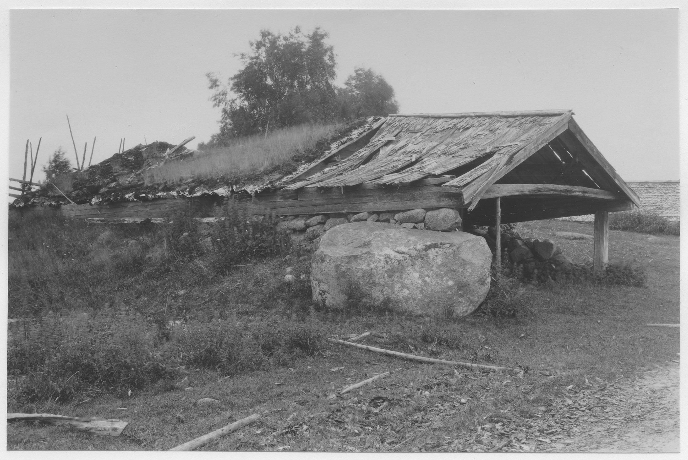 Beskrivning: Bastu, delvis inbyggd i backe. Sido- och bakväggar av gården, resten av bilat timmer.