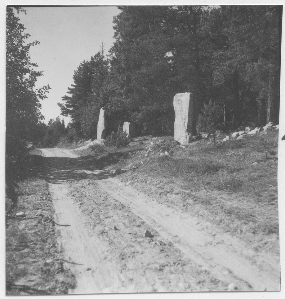 Beskrivning: Förmodligen resta runstenar vid sidan av en skogsväg.