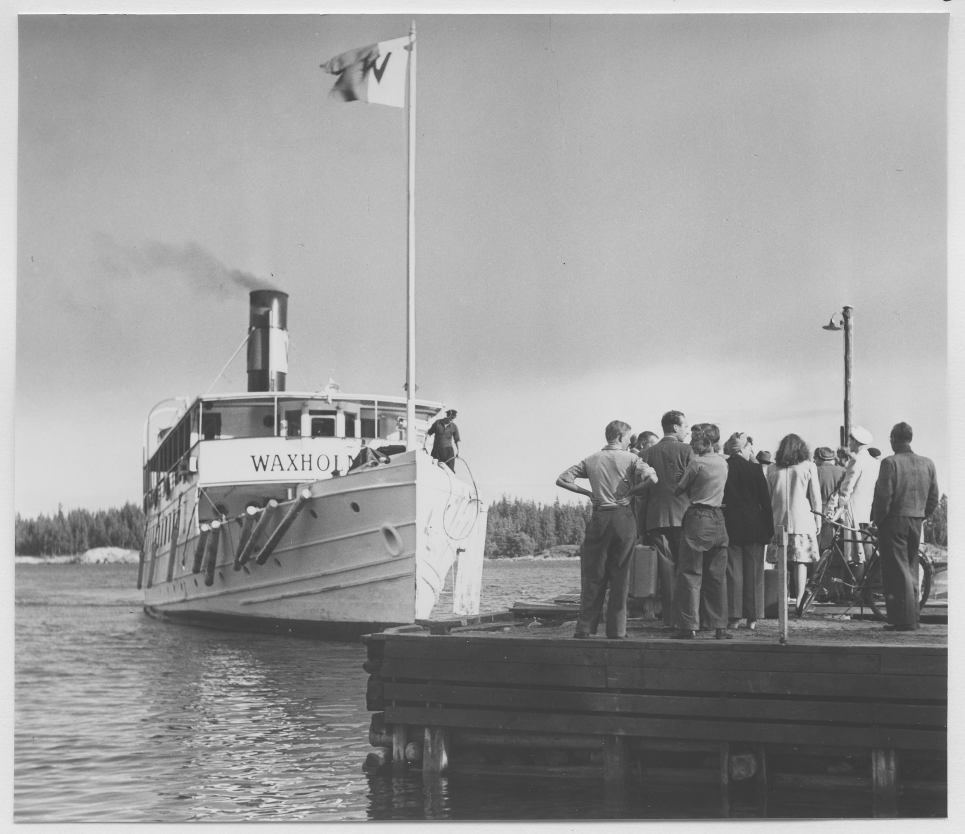 Beskrivning: Ångbåt från Waxholmsbolaget anlöper brygga.