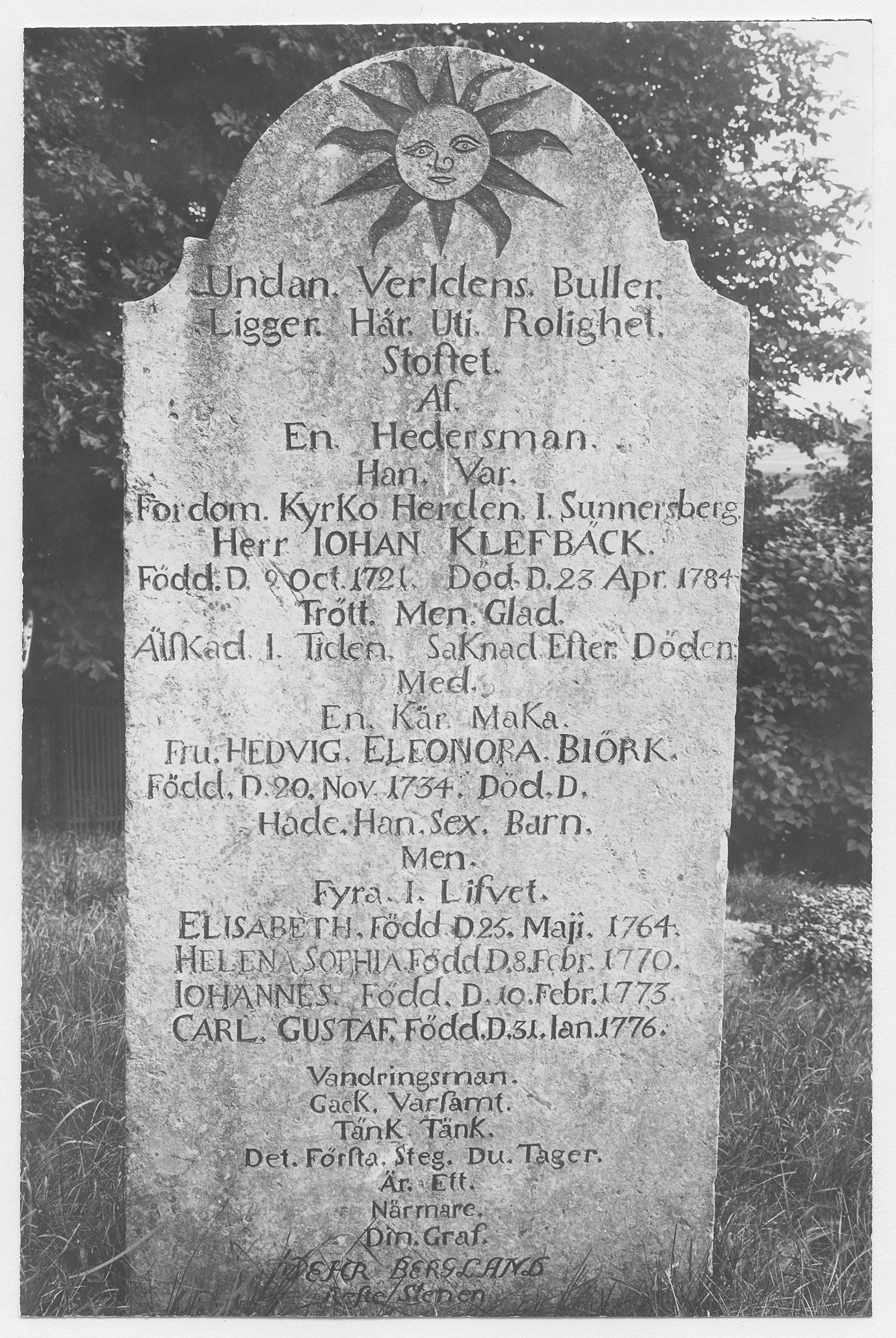 Beskrivning: Minnesvård över kyrkoherden Johan Klefbäck (1721-1784).