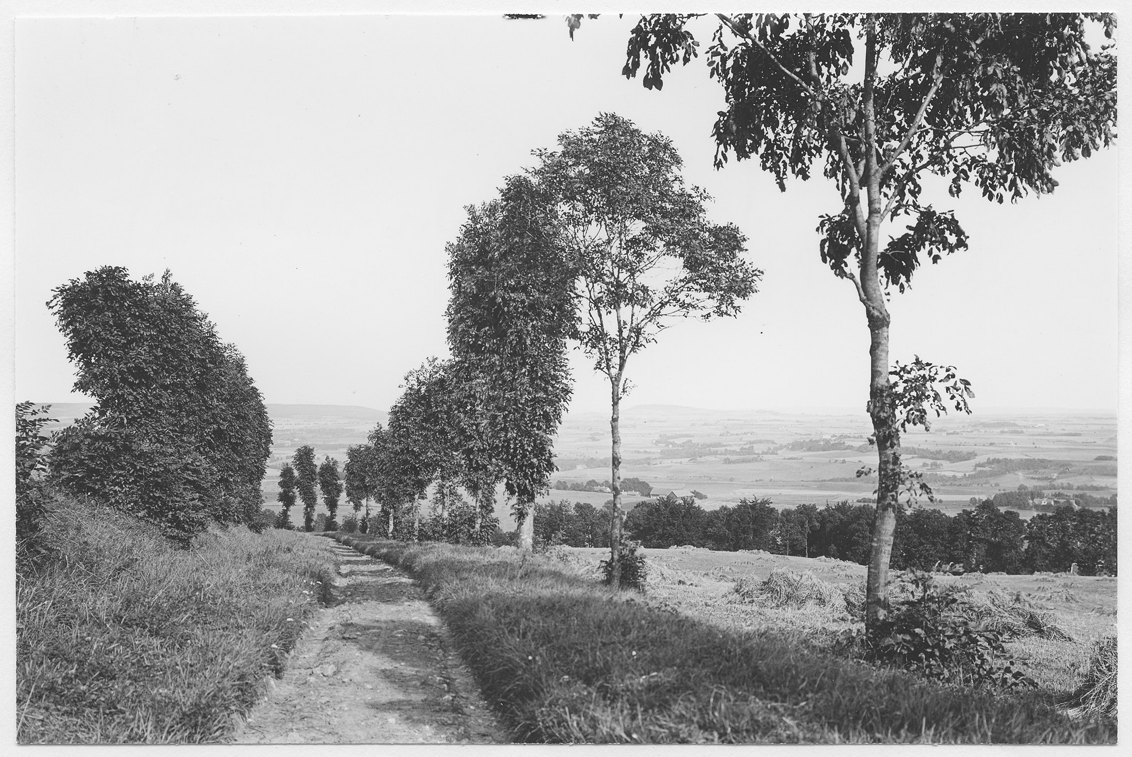 Beskrivning: Väg uppför Ållebergs östra sluttning med genom lövtäkt hamlade träd.