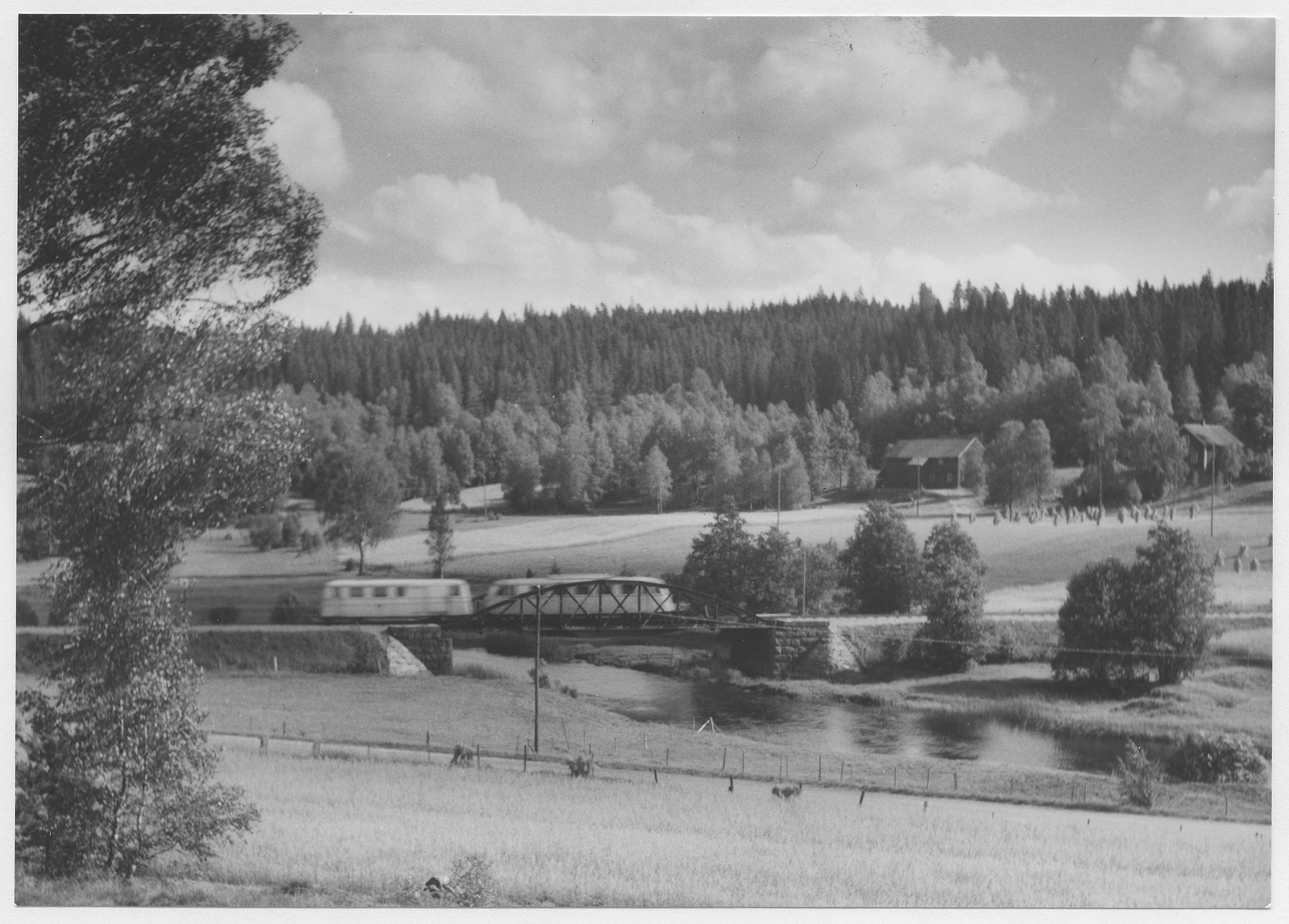 Beskrivning: En buss med släpvagn på väg över landsvägsbron.