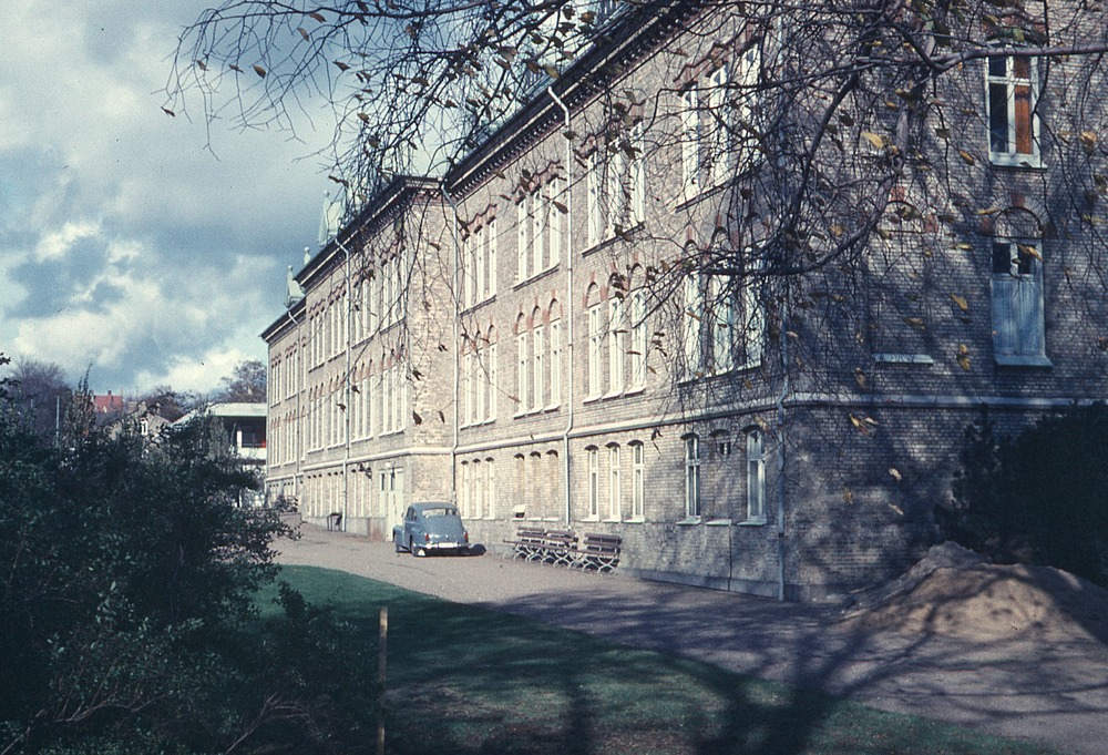 I förgrunden gata. I bakgrunden två och trevåningsbyggnad
