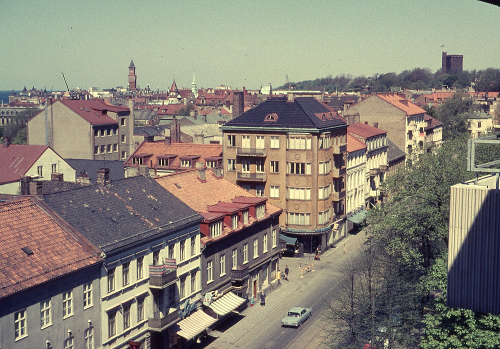 Utsikt över strdsbebyggelse med Södergatan i förgrunden
