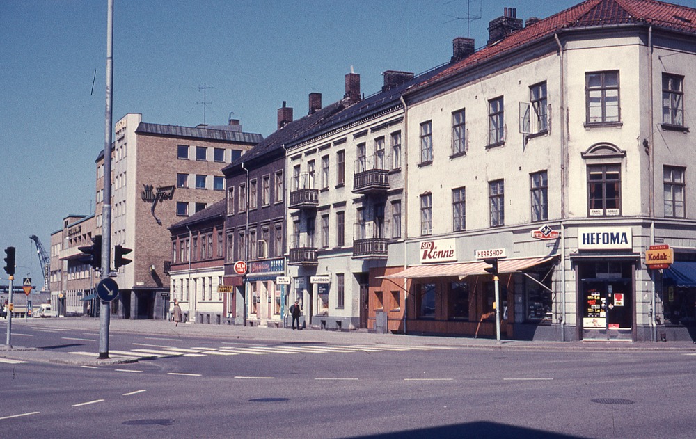 I förgrunden en gatukorsning med övergångsställe. I balkgrunden två- och flervåningsbyggnader med butiker i bottenplanet